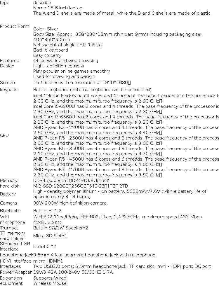 【Nome】: laptop da 15,6 pollici