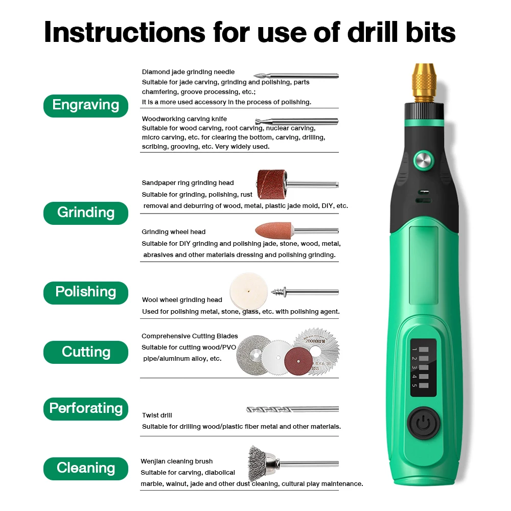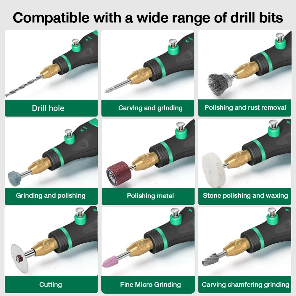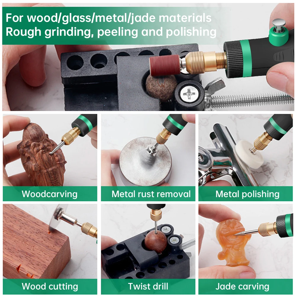 Ampiamente utilizzato: adatto per intagliare giada, agata, cera d’api, fiori in ceramica, intaglio del metallo, intaglio del vetro, intaglio nucleare, intaglio del legno, piastra in alluminio a terra, piastra in rame sottile, piastra in plastica, scheda chip, circuito stampato, scheda epossidica. Adatto per intagliare (intaglio nucleare/intaglio di uova/intaglio di ossa/intaglio di giada), taglio, lucidatura, intaglio, fresatura, lucidatura, taglio, rimozione e foratura.