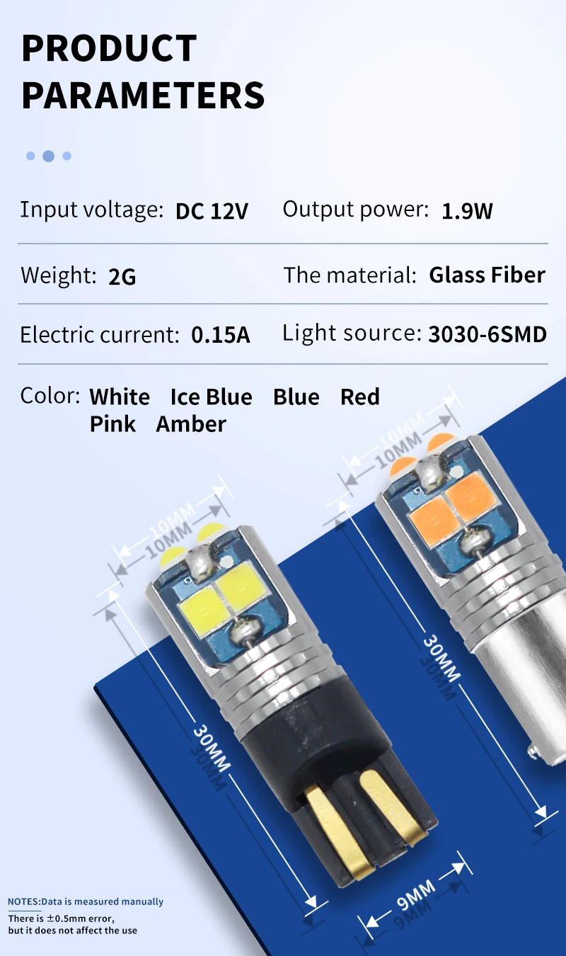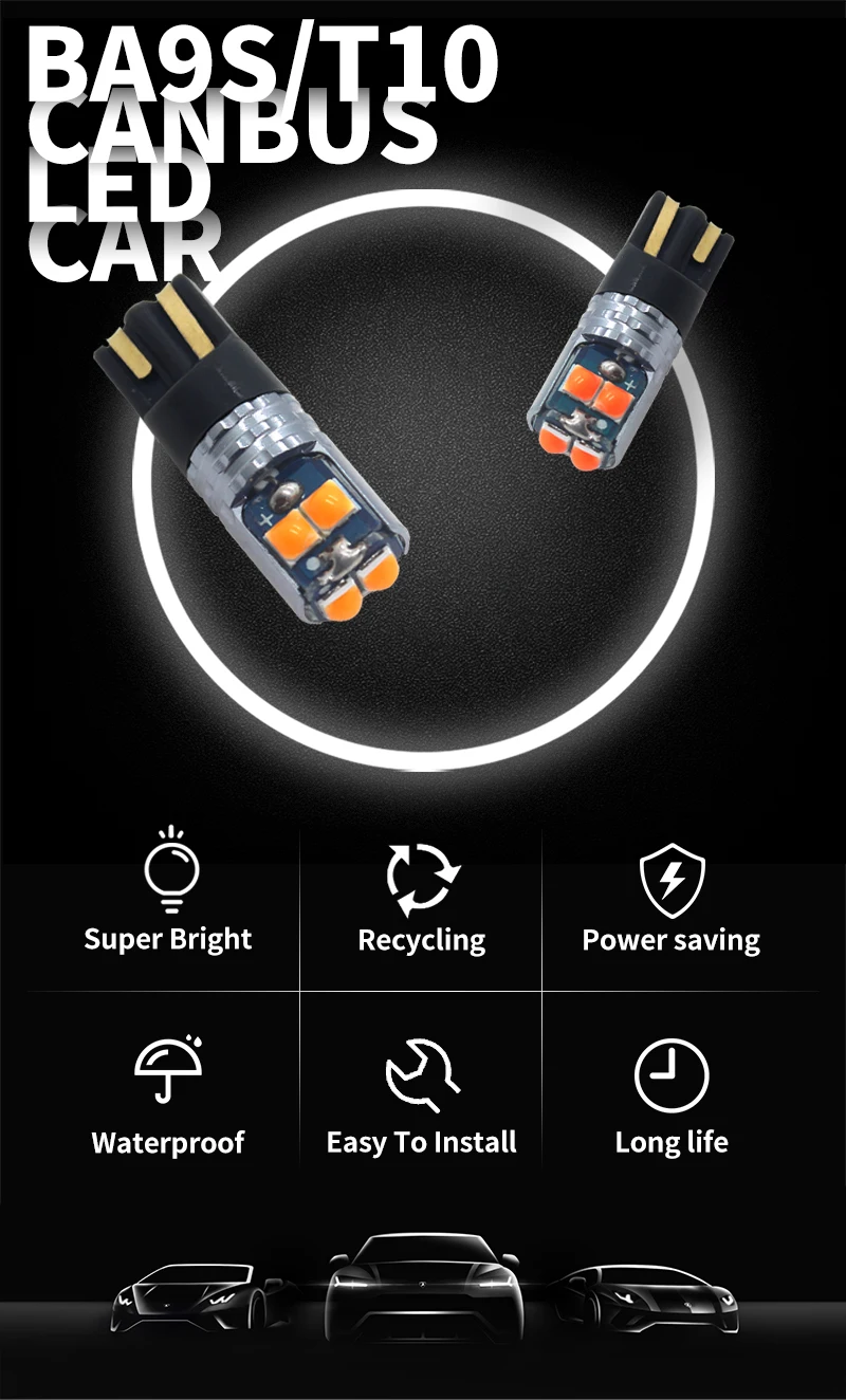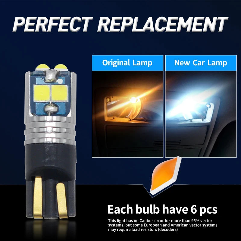2/4/6/8/10 pezzi Canbus T10 LED super luminoso 194 168 W5W BA9S nessun errore 3030 6SMD Lampada da parcheggio Luce interna auto Ambra Giallo BiancoNOTA:1.La lampadina ha una funzione di decodifica in grado di decodificare il 95% dei modelli di auto (non privo di errori al 100%, si prega di notare)2.Le auto tedesche e italiane non possono decodificare, per evitare errori, aggiungere una coppia di resistori di carico.Caratteristiche:100% nuovo di zecca, qualità TOP A, facile da usare;Lunga durata, basso consumo energetico e più luminosoLa nuova tecnologia LED riduce il consumo energetico dal 43% all’81%Importazione di luce/dissipazione del calore in lega/lente in vetro.Alta luminosità/Risparmio energetico/Lunga durata/Ampia gammaToppa per lampada 3030 di alta qualità con ceramica per dissipatore di caloreDescrizione:Tipo di chip LED: 3030 chipQualità chip LED: 6 chipColore chiaro: bianco, rosso, rosa, blu, blu ghiaccio, arancioneTipo di presa: T10 W5W 194 168/BA9SVoltaggio: 12VPotenza nominale: 1 WColore: Blu ghiaccio Blu Rosso Bianco Ambra RosaDurata della vita: 60.000 oreApplicazione:Cupola per auto, luci per mappa, indicatori di direzione, luci di posizione laterali, luci per cruscotto, luci per targa, luci per mappa e così via.Il pacchetto include:Lampadina LED T10 2/4/6/8/10 pezzi