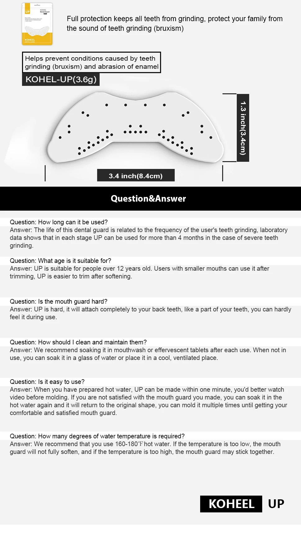 FACILE DA UTILIZZARE: Quando hai preparato 180℉ acque calde, può essere modellate entro un minuto.Se non è soddisfatto con la tutore che hai fatto, puoi pattalo nella acqua calda di nuovo e non rovescierà alla forma originale.puoi stampare più tempi fino a ottenere il tuo paradenti comodo e soddisfatto.