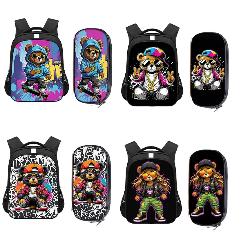2 pezzi Set Cute Graffiti Female Bear Doll Print zaino ragazzi ragazze borse da scuola studente Bookbag Pencil Box forniture scolastiche regalo