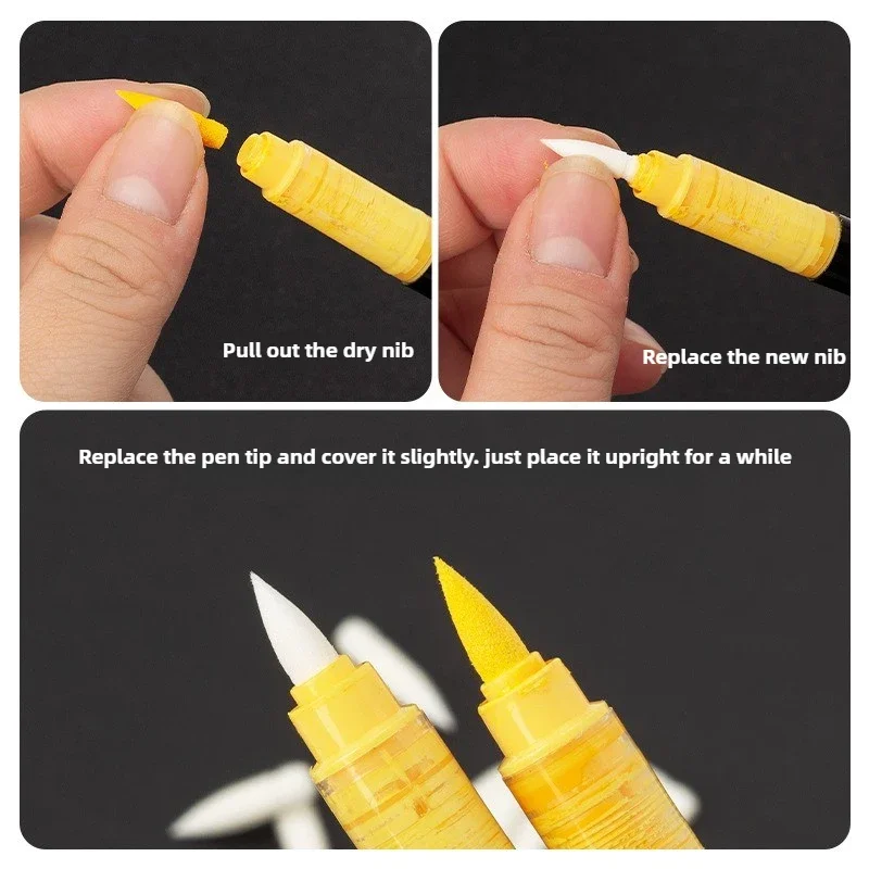 Il processo di sostituzione è magicamente semplice: tira fuori delicatamente la vecchia punta e inizia immediatamente la nuova vita.Non sono necessari strumenti professionali: un " trapianto cardiaco" di tre secondi per il tuo pennarello.Tappo la penna, scuotila delicatamente per risvegliare l’inchiostro battente, posizionala verticalmente per un attimo e assisti al colore che scorre di nuovo dalla punta, come se colleghi la tua creatività a una fonte di alimentazione infinita.