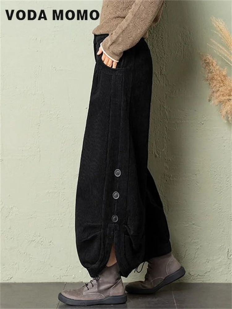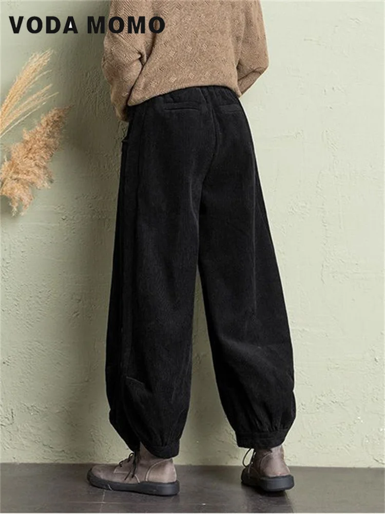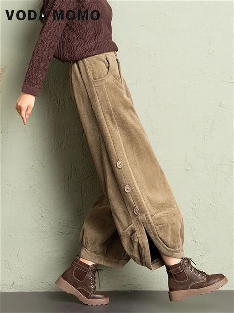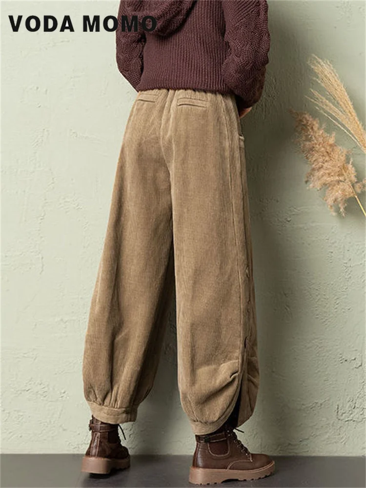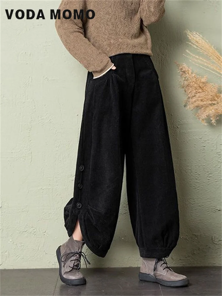 2023 autunno inverno Vintage a vita alta lanterna pantaloni donna bottone laterale larghi pantaloni Casual larghi gamba larga pantaloni di velluto a coste donna