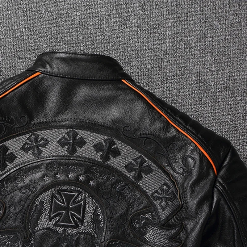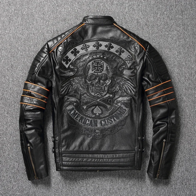 2024 New Skull ricamo giacca da uomo in pelle di vacchetta primo strato cappotto Oversize sottile da moto 12024 New Skull ricamo giacca da uomo in pelle di vacchetta primo strato cappotto Oversize sottile da moto