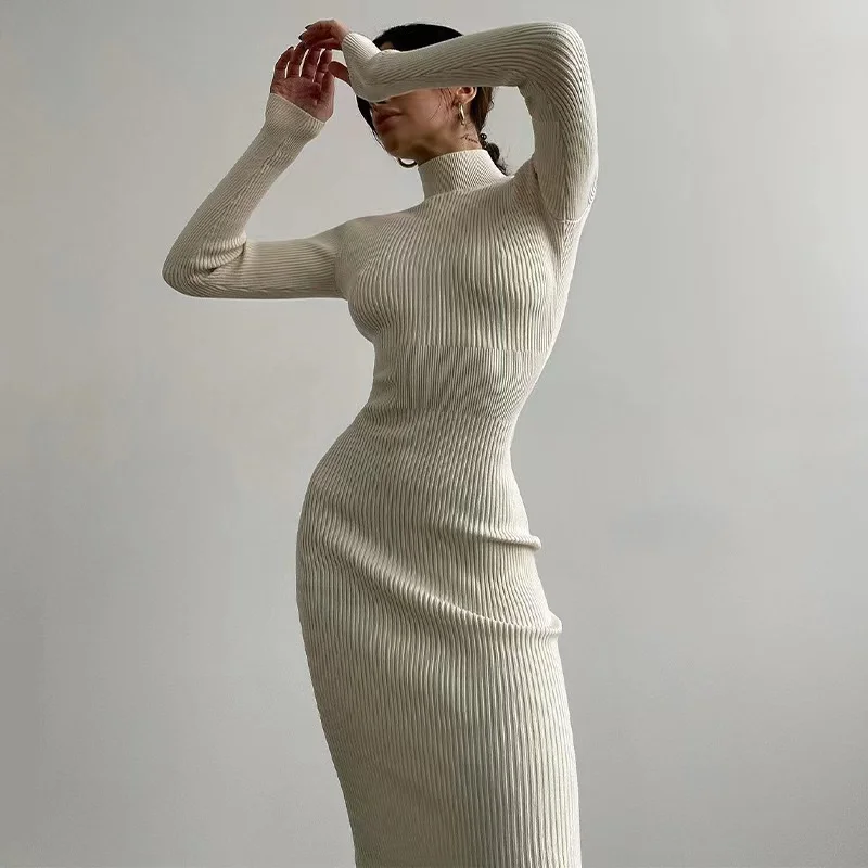 2024 Nuovo Autunno Dolcevita lavorato a maglia Abito da donna Manica lunga Aderente Abiti longuette Femminile Elegante Moda Tinta unita Abito attillato