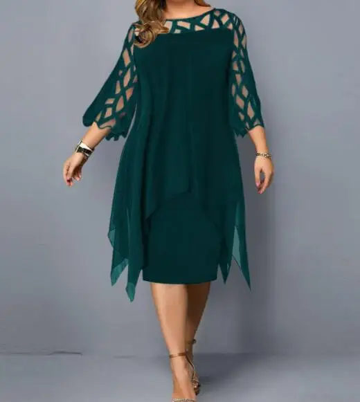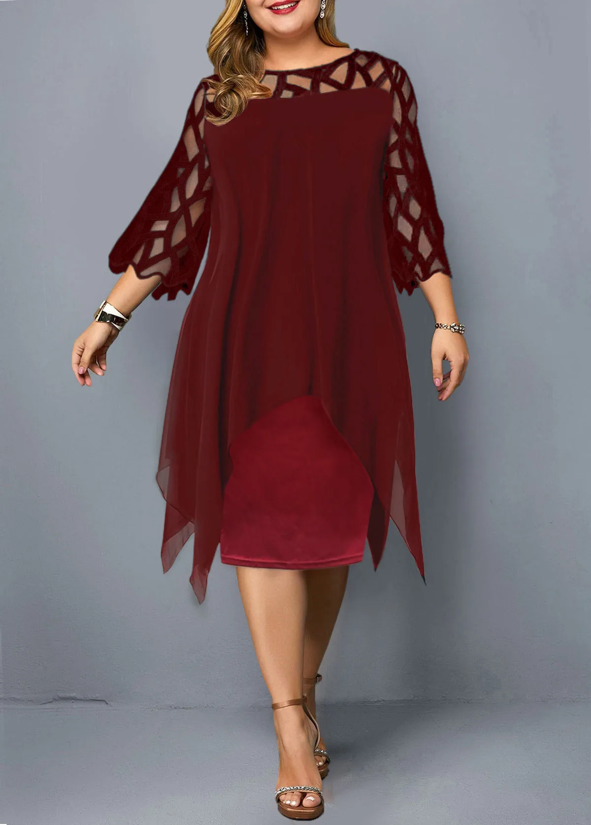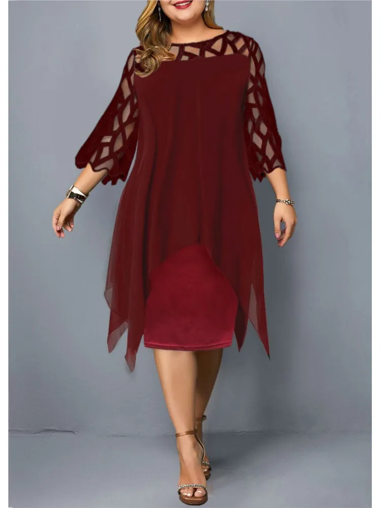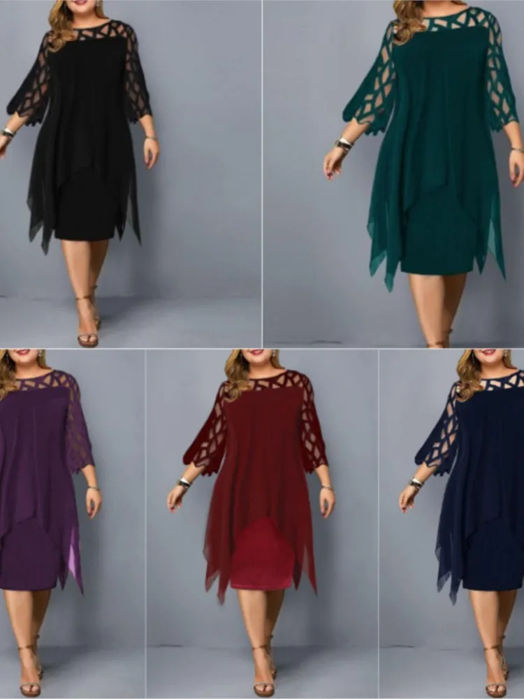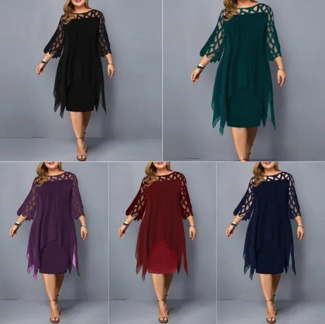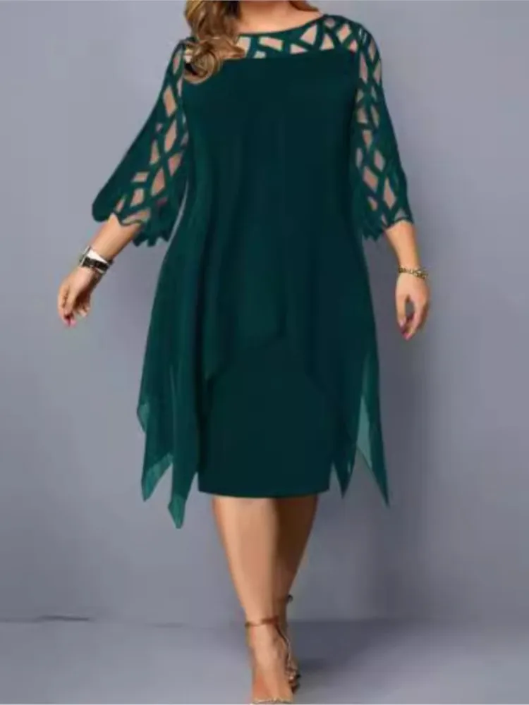 2024 Primavera Autunno Donna New Fashion Lace Hollow Splicing Manica a sette quarti Irregolare Chiffon di canapa Abito al ginocchio