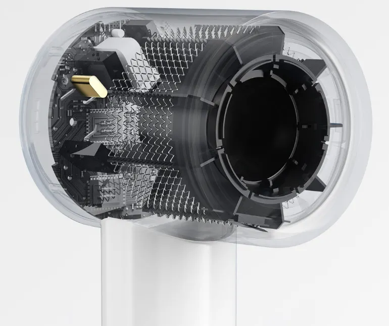 Dotato di motore CNC lavorato con precisione con velocità di fino a 110.000 giri/min, è una migliore stabilità e porta una sensazione di vento più forte.La velocità del vento della presa d’aria può raggiungere 62 metri/secondi, che soffia rapidamente i capelli per asciugare l’umidità e sperimenta una nuova velocità di asciugatura rapida.