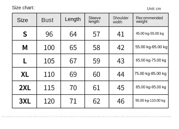XL: Busto: 110 cm, Lunghezza: 69 cm, Lunghezza manica: 60 cm, Larghezza spalle: 44 cm