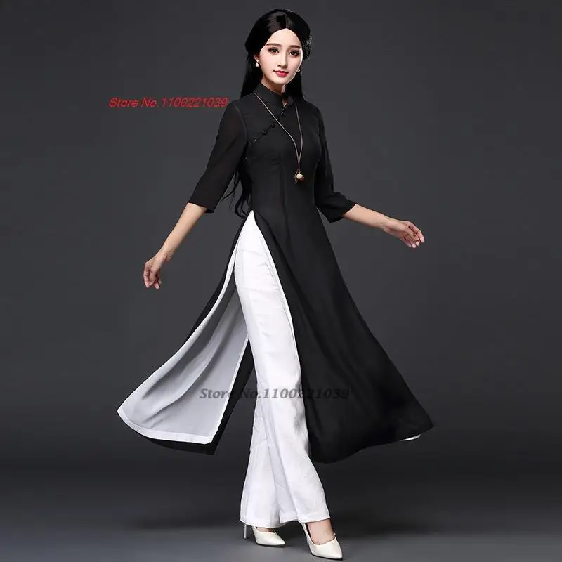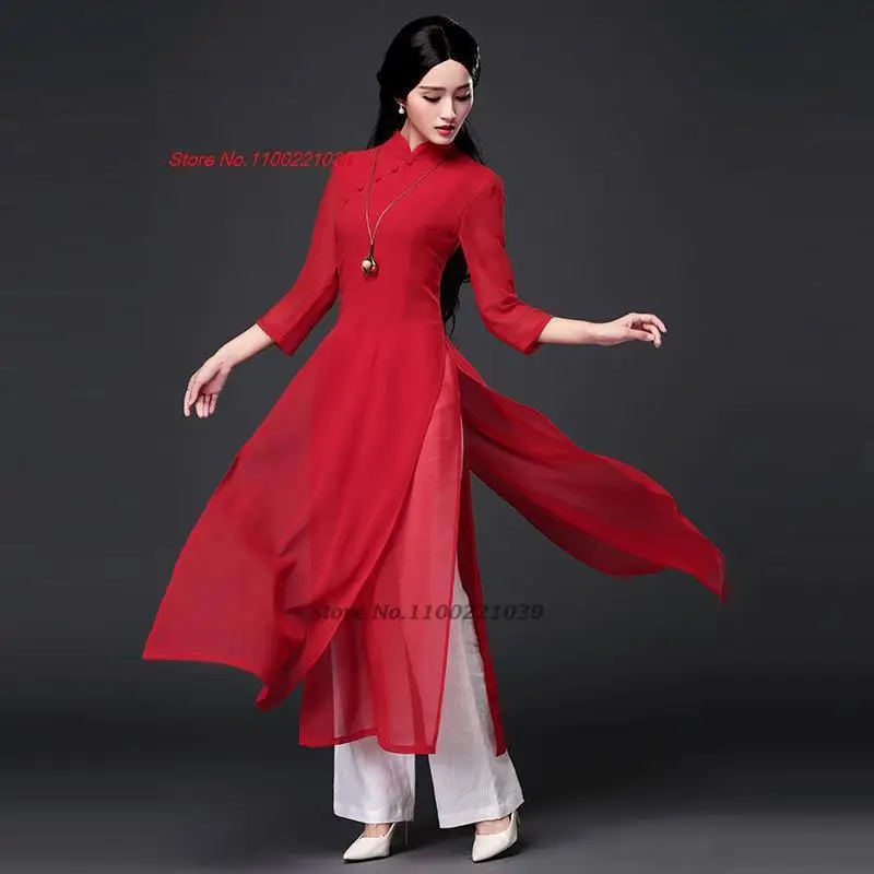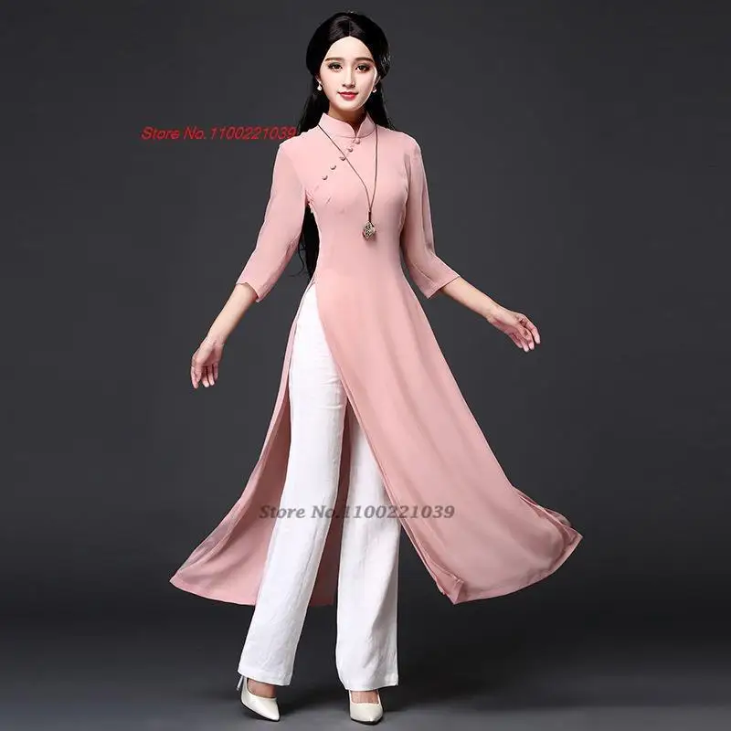 2025 abito aodai in stile folk tradizionale + pantaloni set vietnam chiffon aodai elegante abito aodai abito orientale abito cheongsam qipao