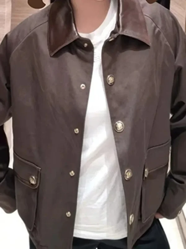 2025 Autunno Donna Tinta unita Giacca moda Ecopelle Colletto rovesciato Tasche monopetto Giacca corta da donna Top 12025 Autunno Donna Tinta unita Giacca moda Ecopelle Colletto rovesciato Tasche monopetto Giacca corta da donna Top