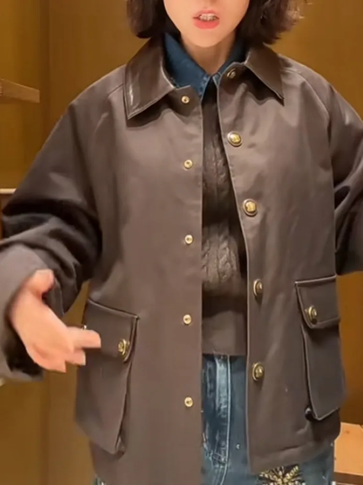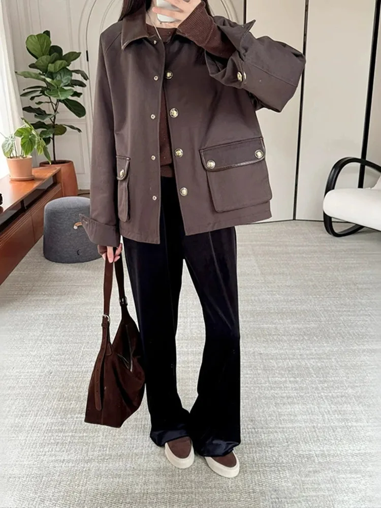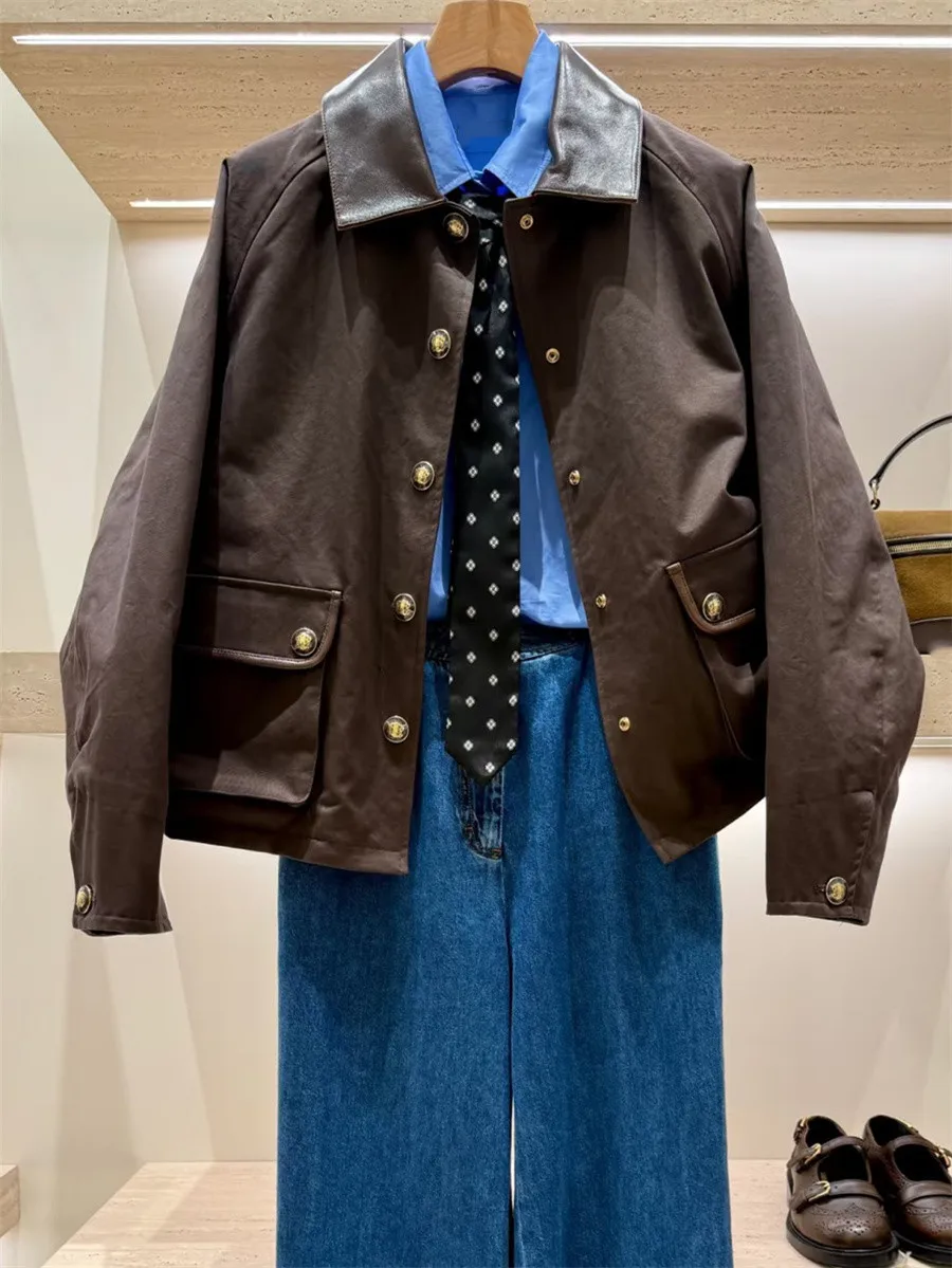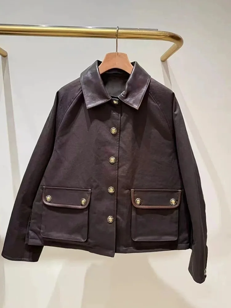 2025 Autunno Donna Tinta unita Giacca moda Ecopelle Colletto rovesciato Tasche monopetto Giacca corta da donna Top