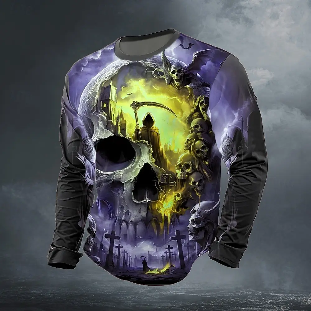 2025 Autunno Inverno Halloween Teschio Stampa T-shirt a maniche lunghe per uomo Goth Streetwear Casual Top Tema Halloween Casual Tees