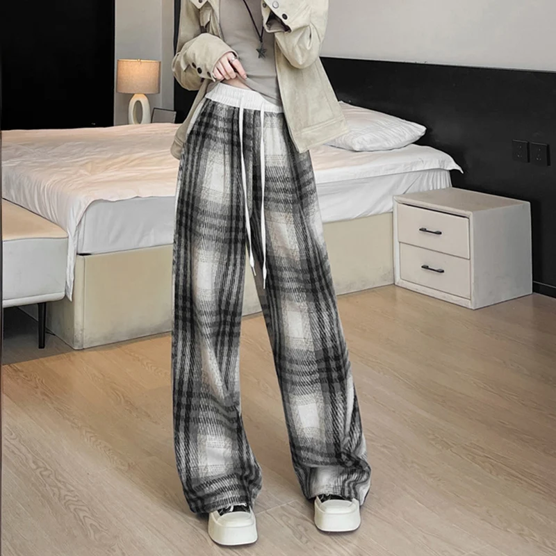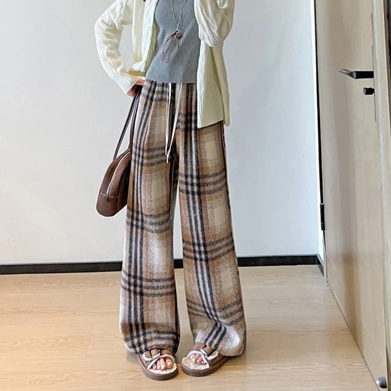 2025 Autunno Inverno Plaid Pantaloni di lana Donna Y2K Moda Streetwear Pantaloni dritti Patchwork Elastico in vita Pantaloni a gamba larga Lady