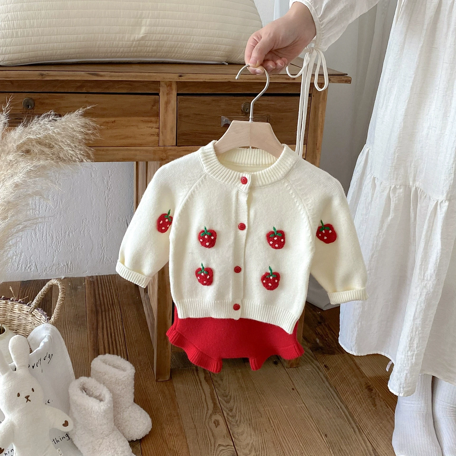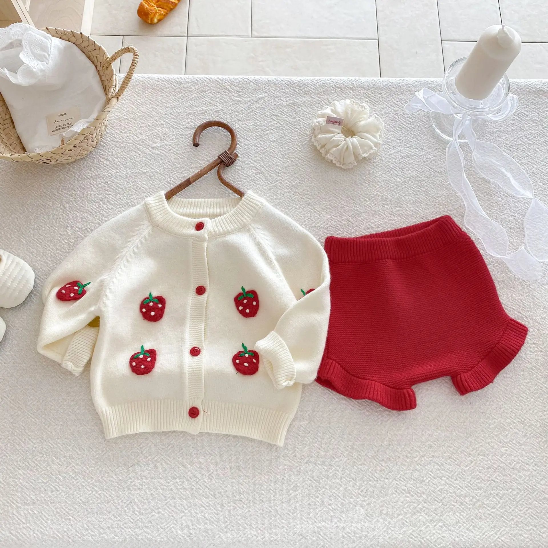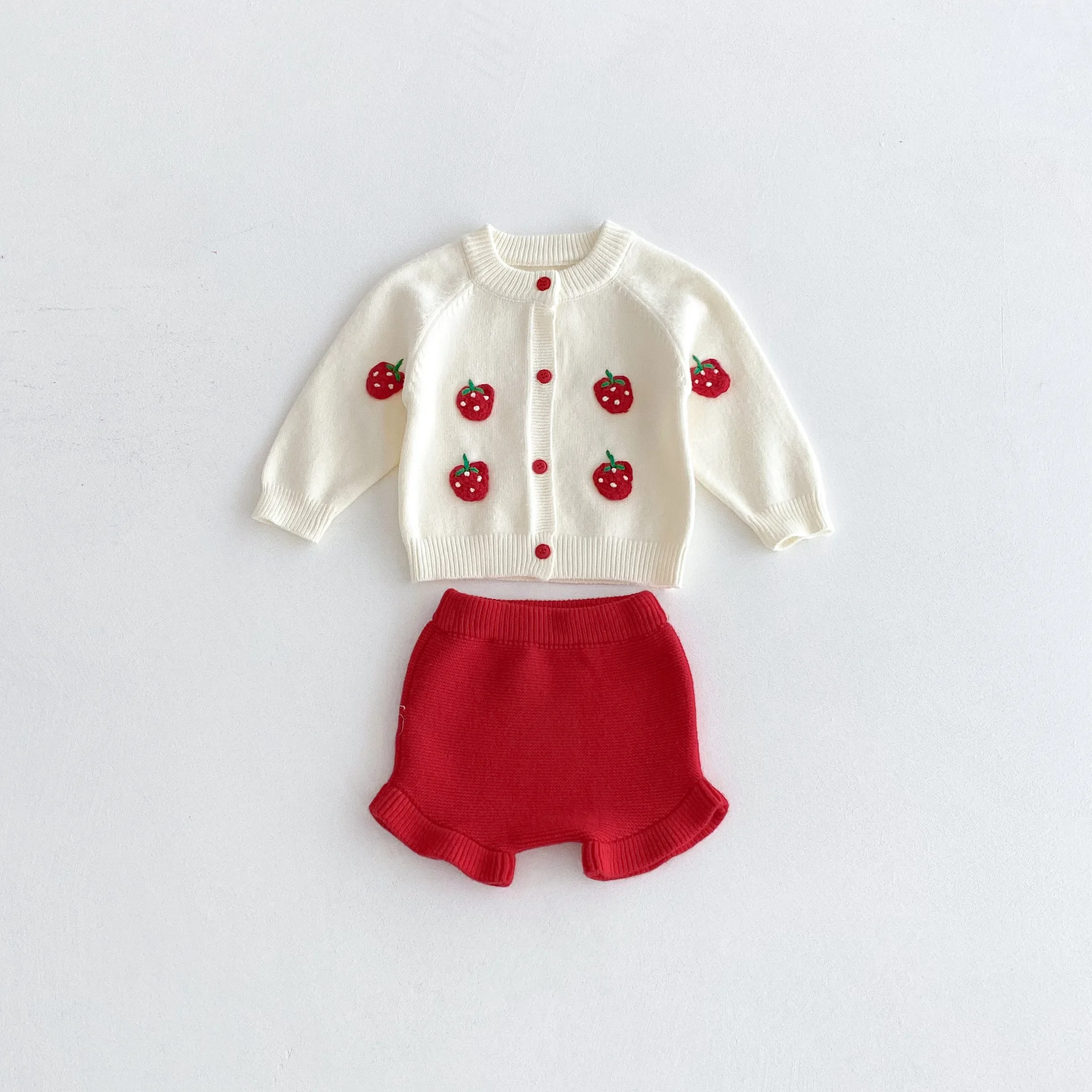 2025 autunno maglia infantile neonate insieme dei vestiti ricamato fragola lavorato a maglia cardigan + pantaloncini bambino neonata vestiti vestito 12025 autunno maglia infantile neonate insieme dei vestiti ricamato fragola lavorato a maglia cardigan + pantaloncini bambino neonata vestiti vestito