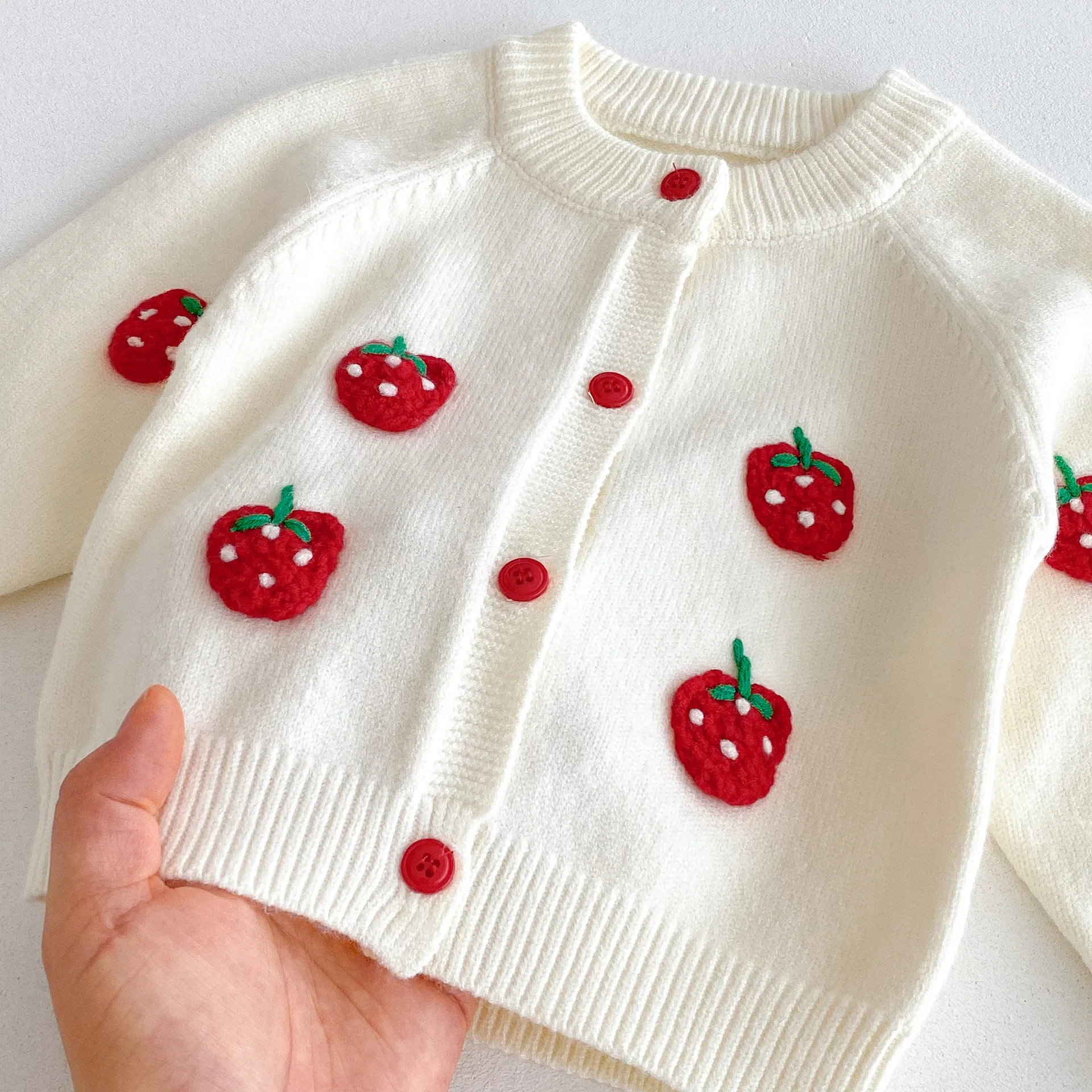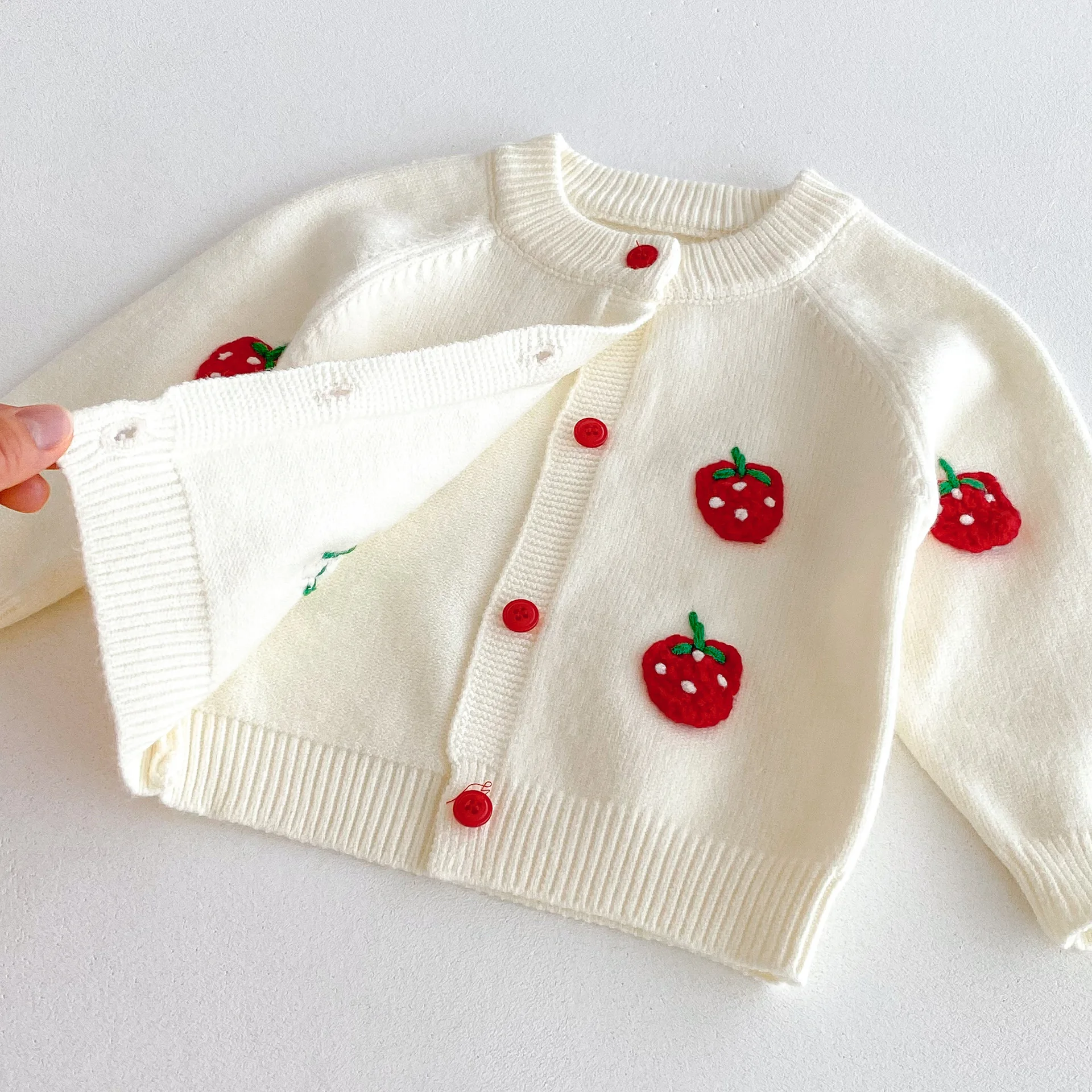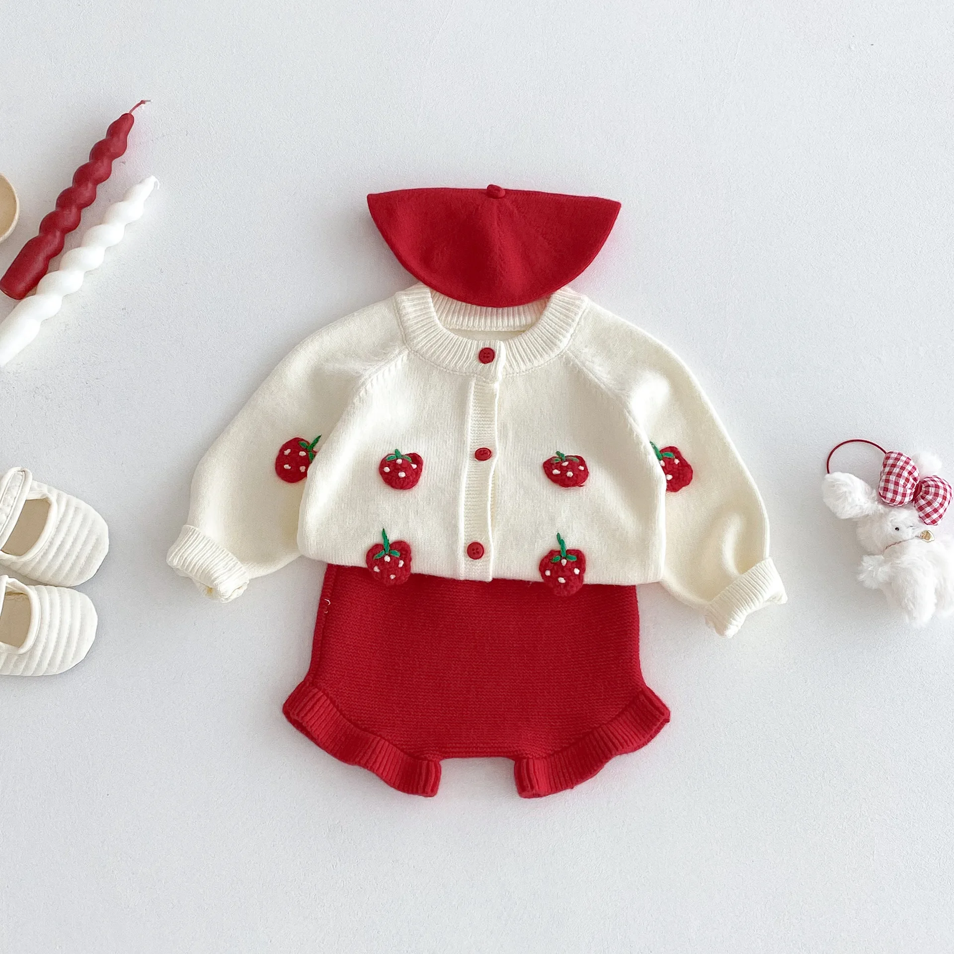 2025 autunno maglia infantile neonate insieme dei vestiti ricamato fragola lavorato a maglia cardigan + pantaloncini bambino neonata vestiti vestito 12025 autunno maglia infantile neonate insieme dei vestiti ricamato fragola lavorato a maglia cardigan + pantaloncini bambino neonata vestiti vestito