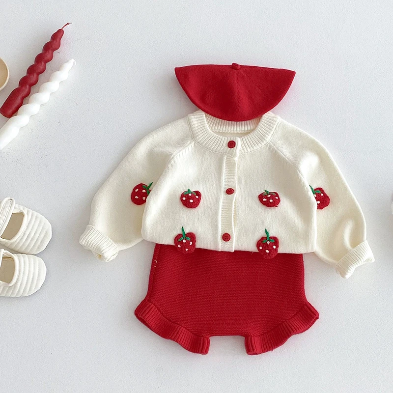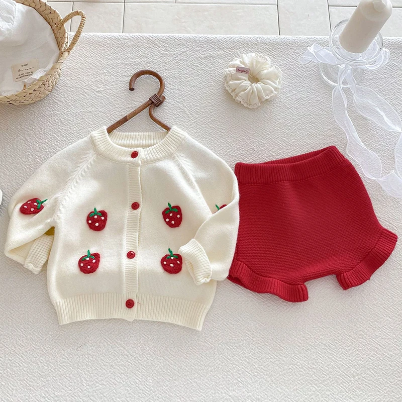 2025 autunno maglia infantile neonate insieme dei vestiti ricamato fragola lavorato a maglia cardigan + pantaloncini bambino neonata vestiti vestito 12025 autunno maglia infantile neonate insieme dei vestiti ricamato fragola lavorato a maglia cardigan + pantaloncini bambino neonata vestiti vestito