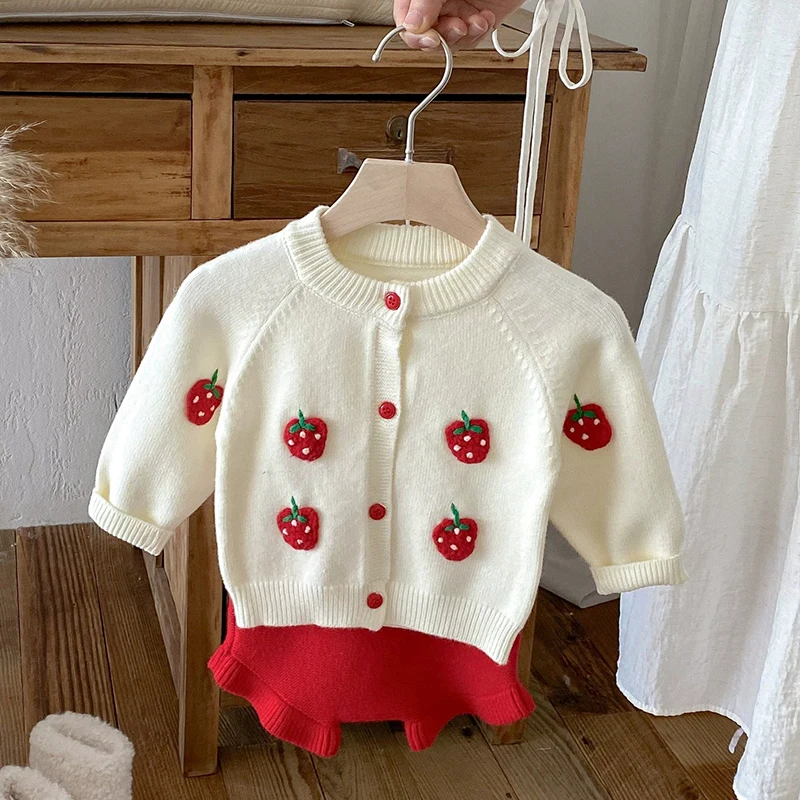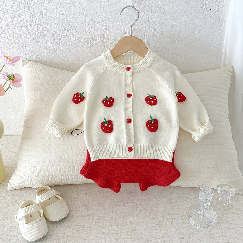 Set di abbigliamento per neonate in maglia autunnale del 2025, lavorato a maglia con fragola ricamata