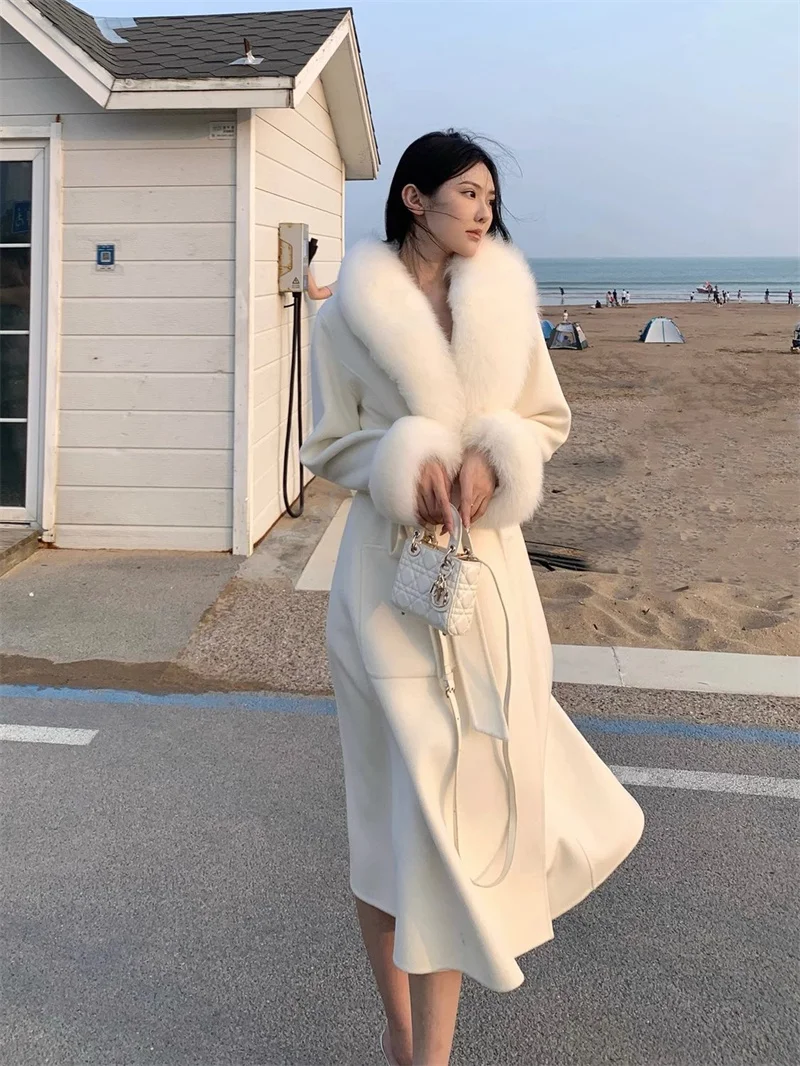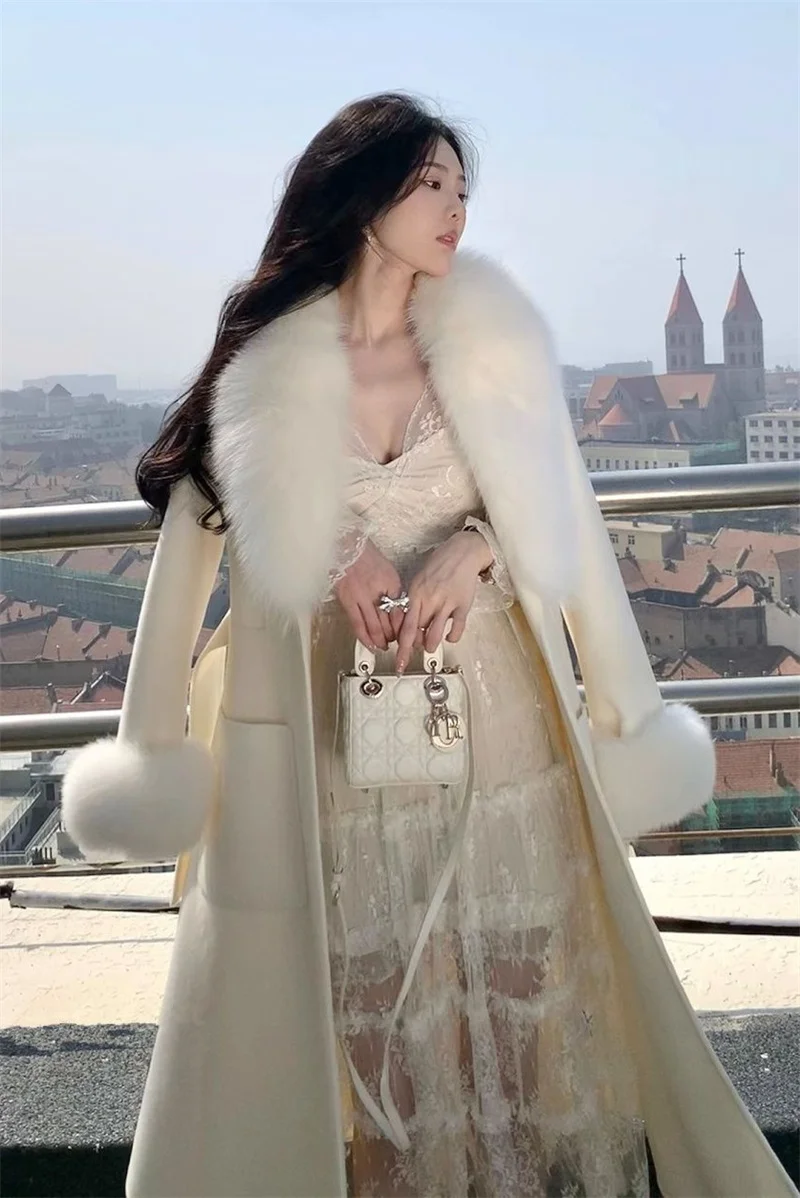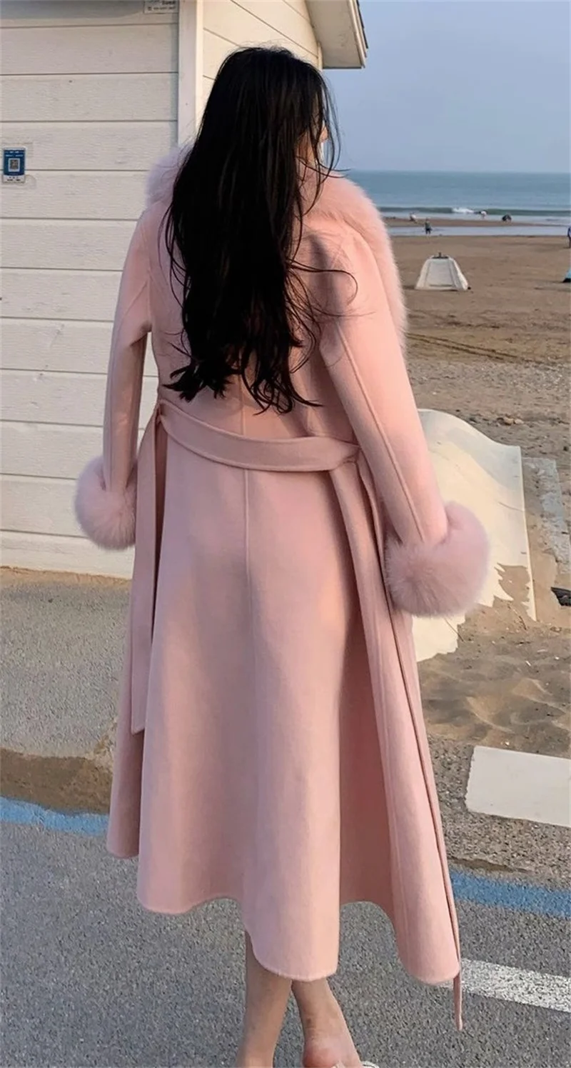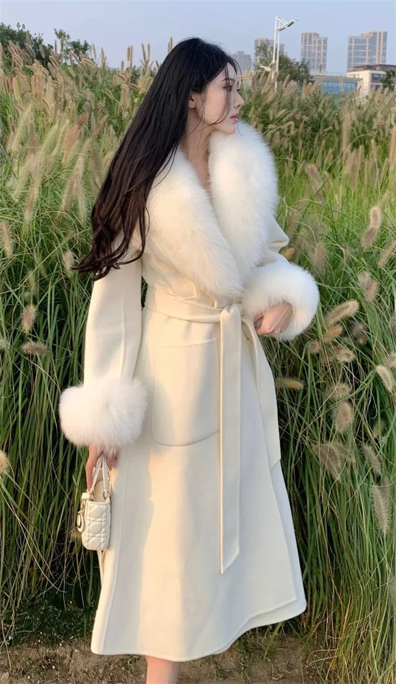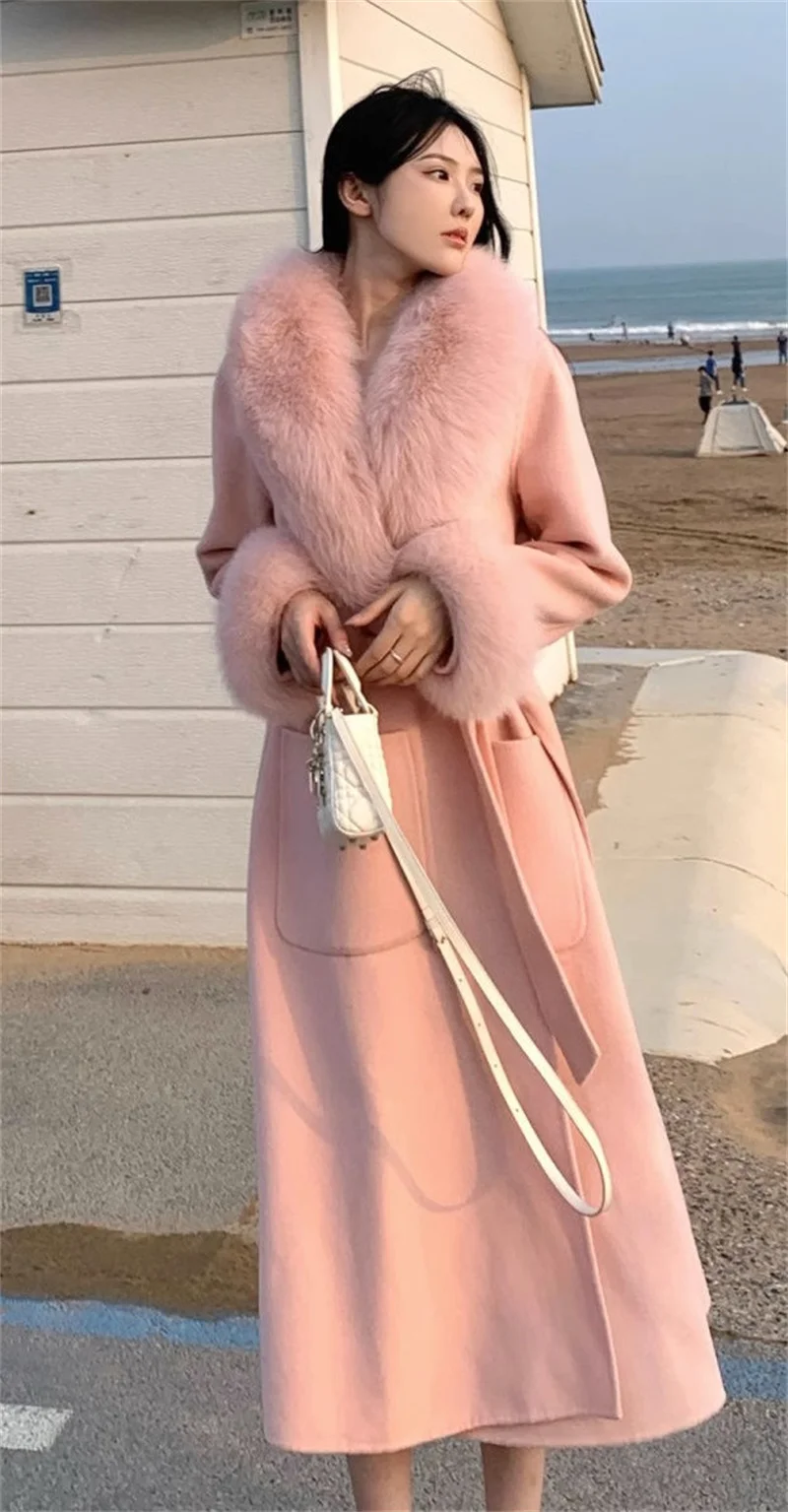 2025 Cappotto di lana di pelliccia di volpe Cappotto lungo da donna Office Lady Elegante cappotto di lana double face 2025 Nuove giacche cardigan allentate
