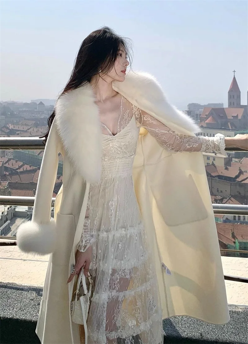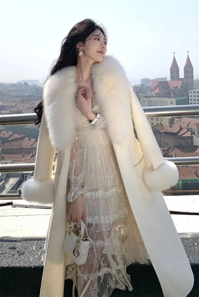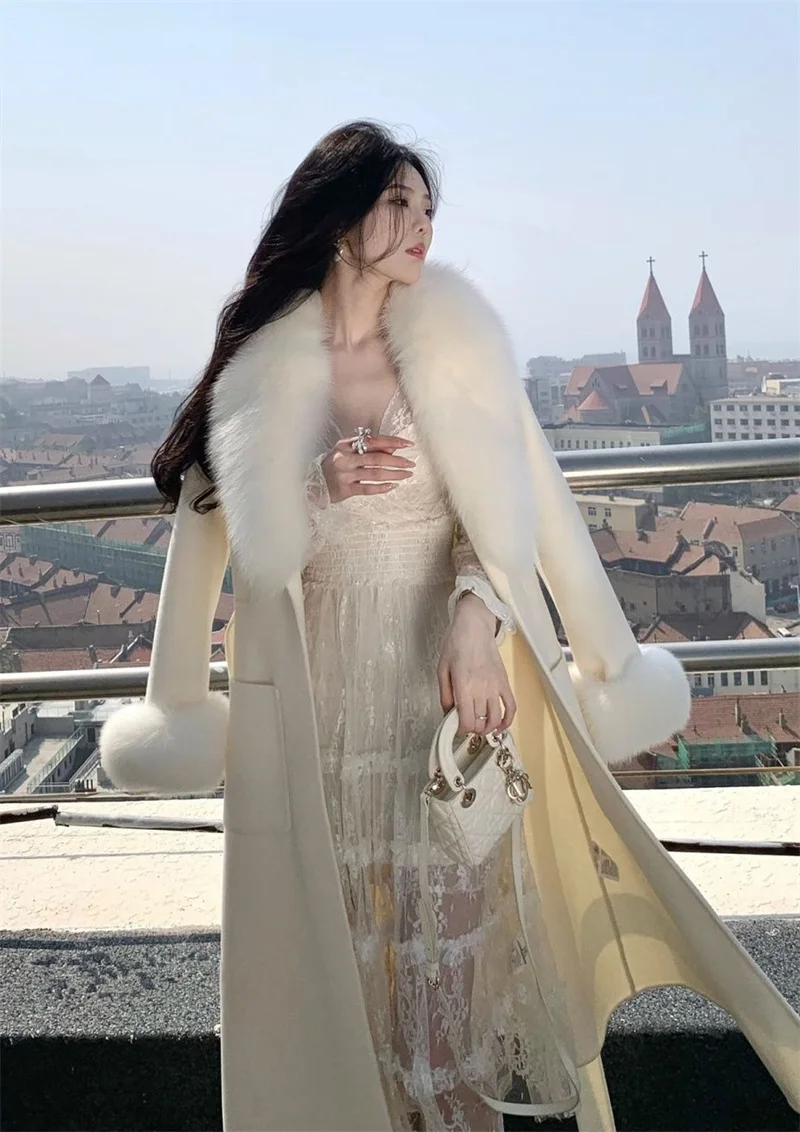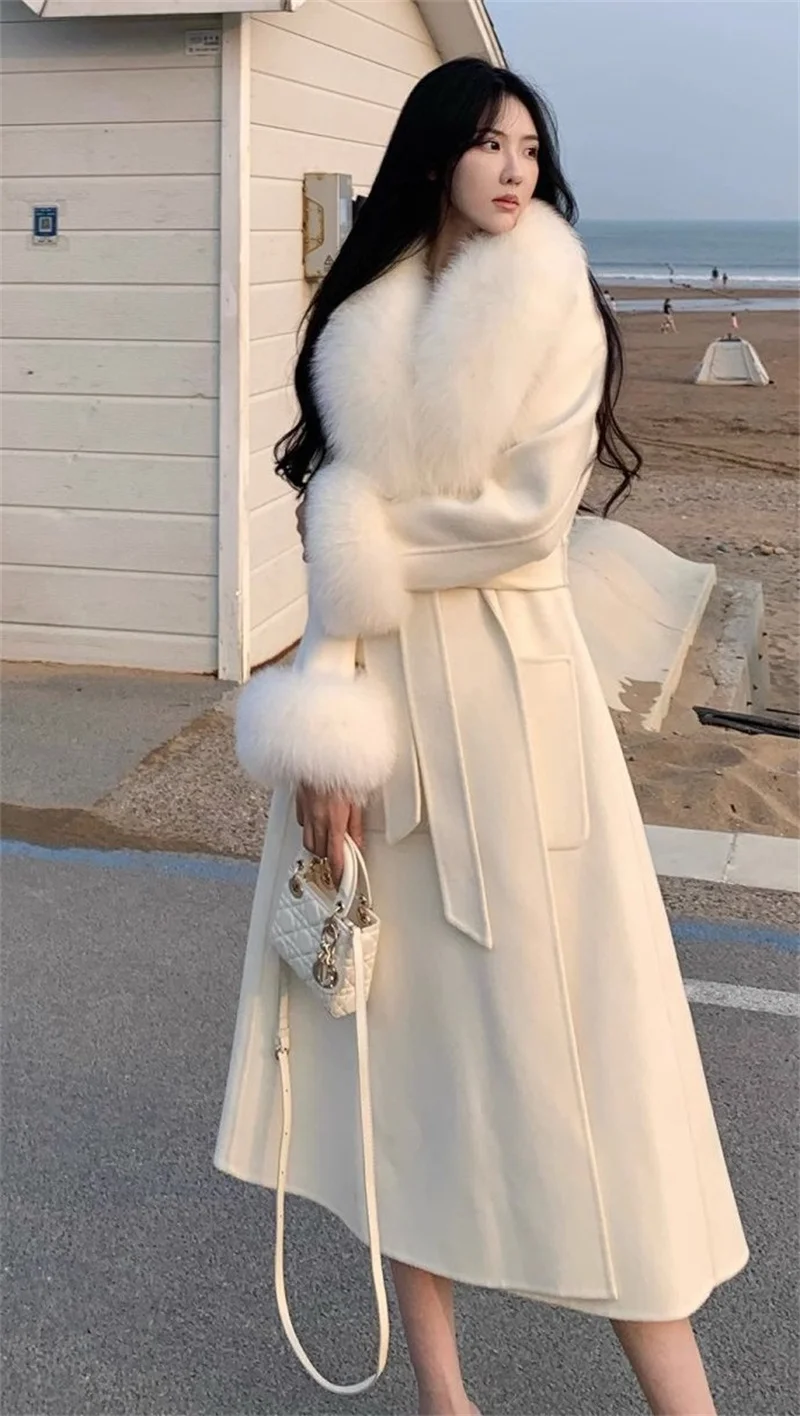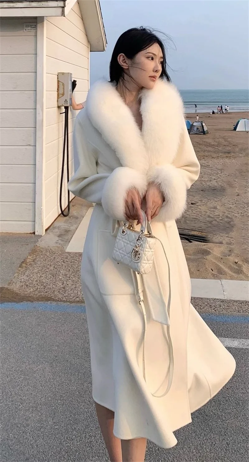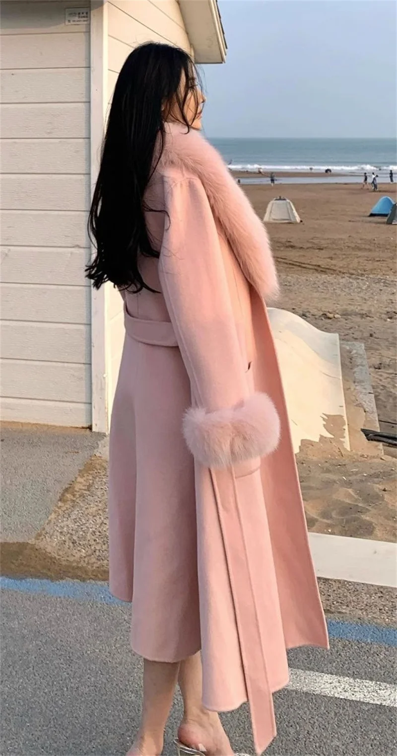 2025 Cappotto di lana di pelliccia di volpe Cappotto lungo da donna Office Lady Elegante cappotto di lana double face 2025 Nuove giacche cardigan allentate