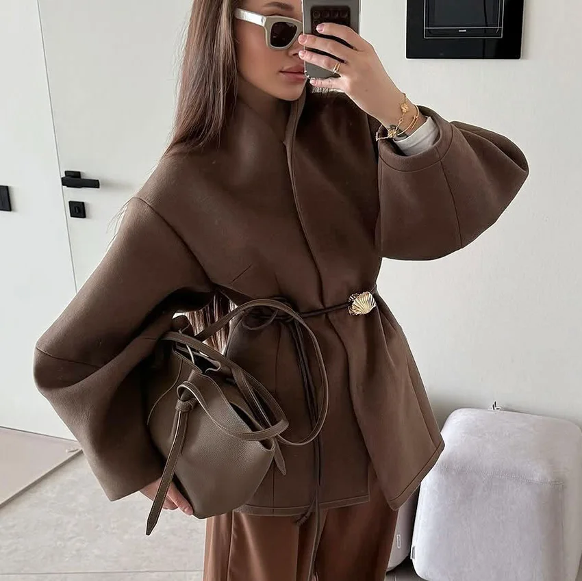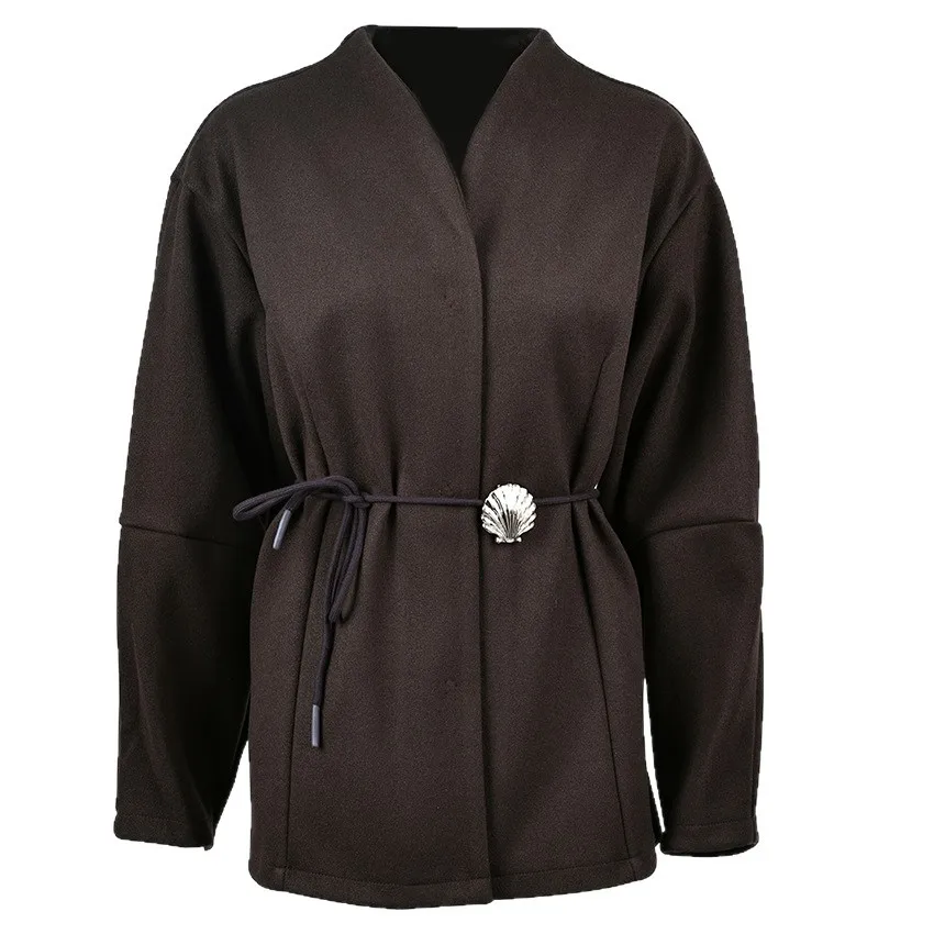 2025 Cappotto di lana solido delle nuove donne di autunno Elegante maniche lunghe Cravatta in vita Abito ampio Giacca da strada quotidiana per pendolarismo alla moda