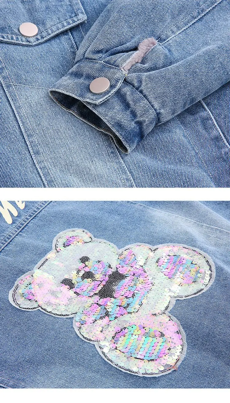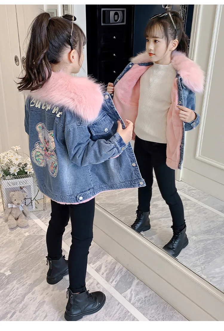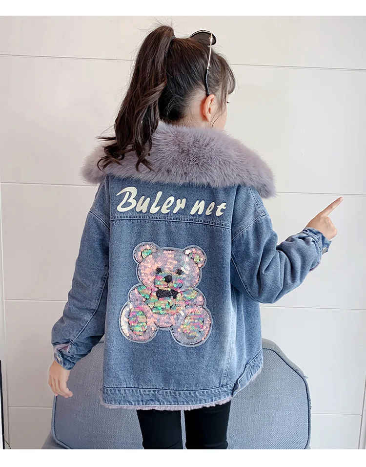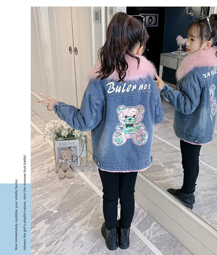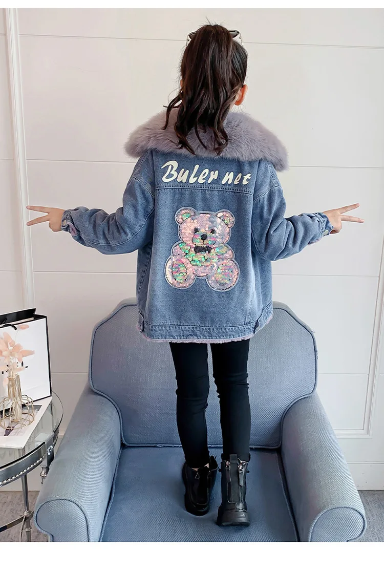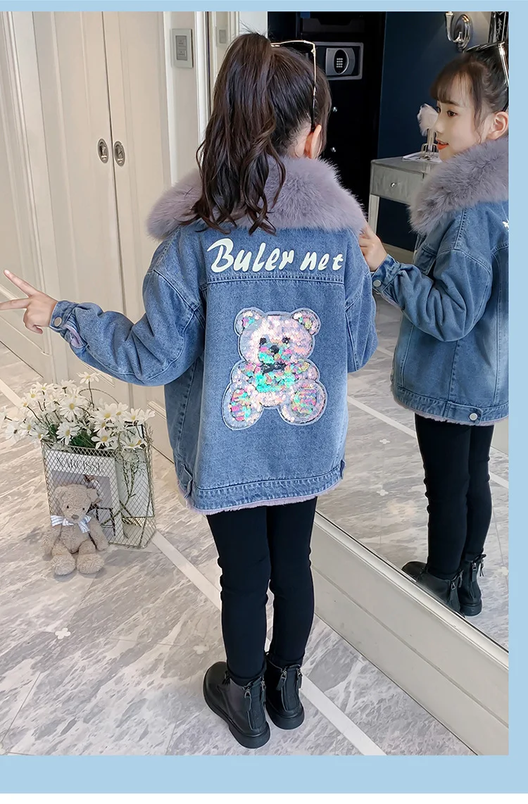 2025 coreano inverno ragazza giacca di jeans cartone animato orso con paillettes più velluto ragazza tuta sportiva cappotto 3-14 anni bambini adolescente Parka 12025 coreano inverno ragazza giacca di jeans cartone animato orso con paillettes più velluto ragazza tuta sportiva cappotto 3-14 anni bambini adolescente Parka