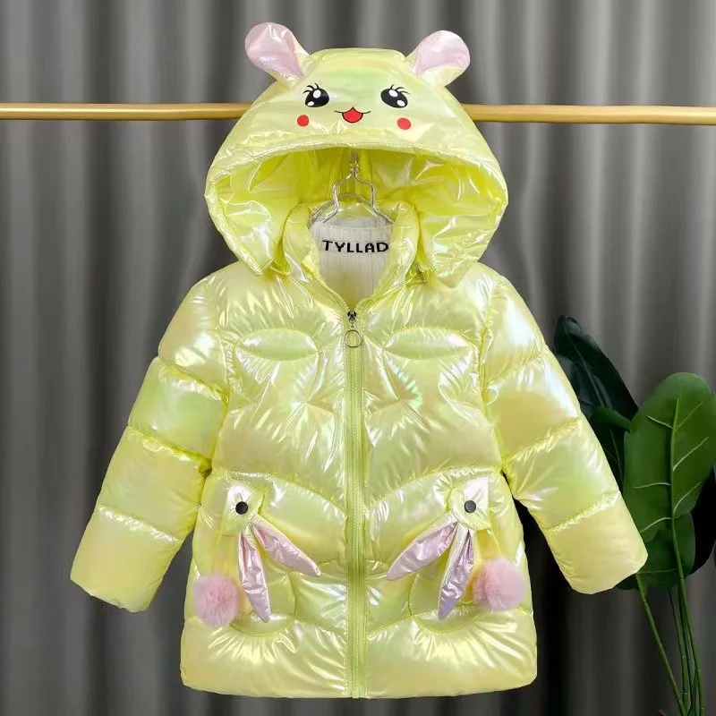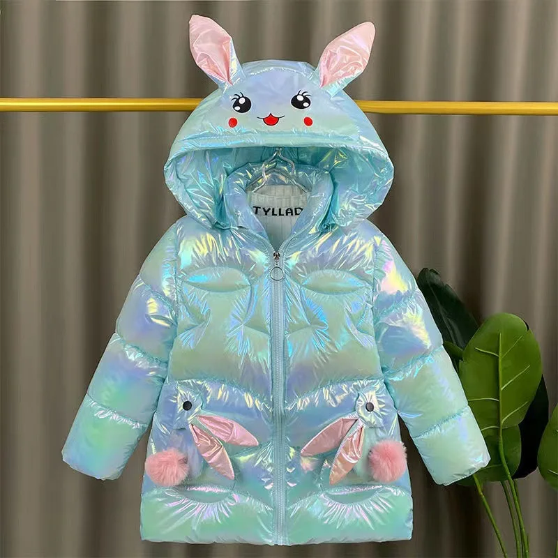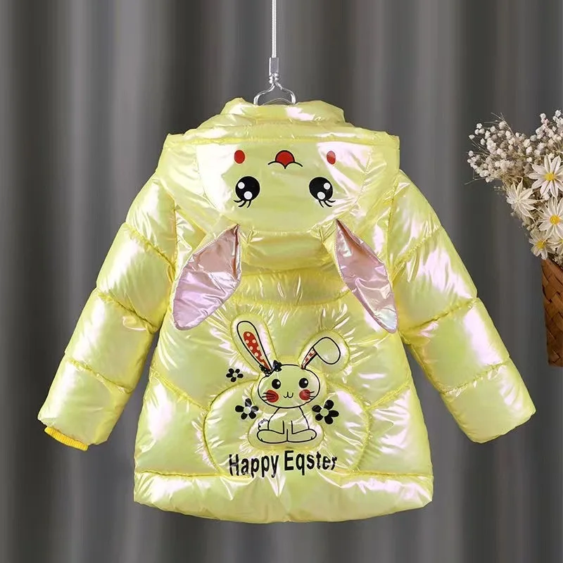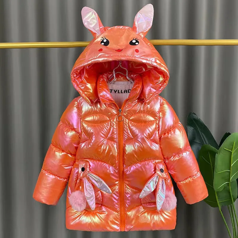 2025 Giacca invernale per ragazze Cappotto orecchie di coniglio carino Impermeabile lucido con cappuccio Capispalla per bambini 1-6 anni Baby Kids Parka Snowsuit