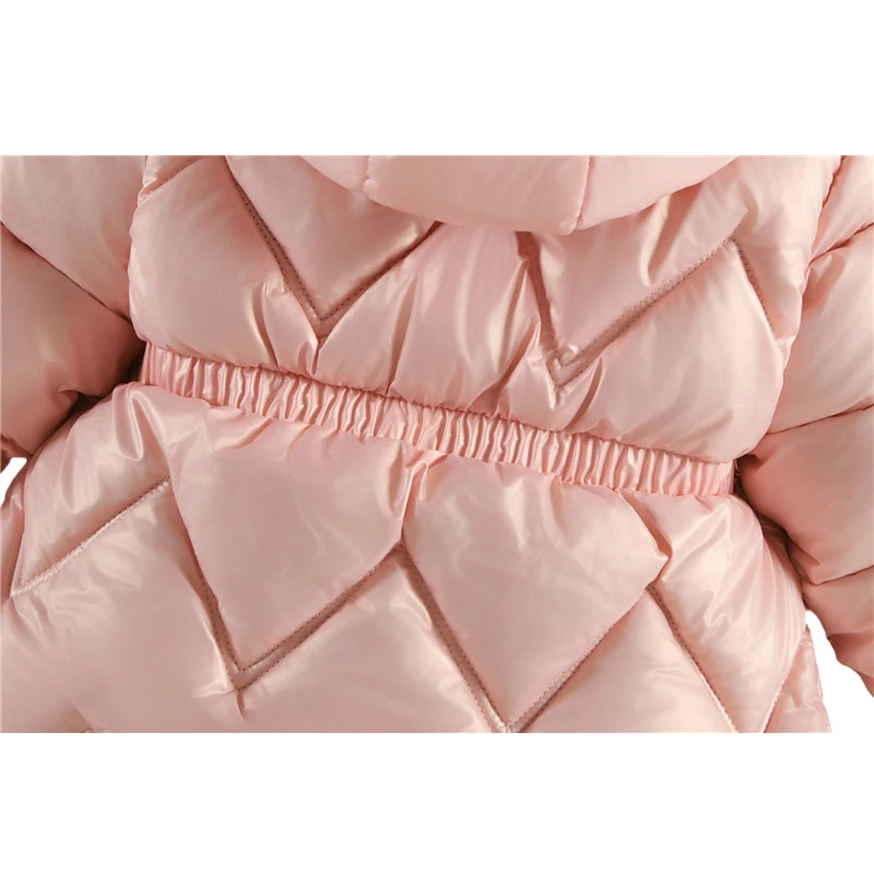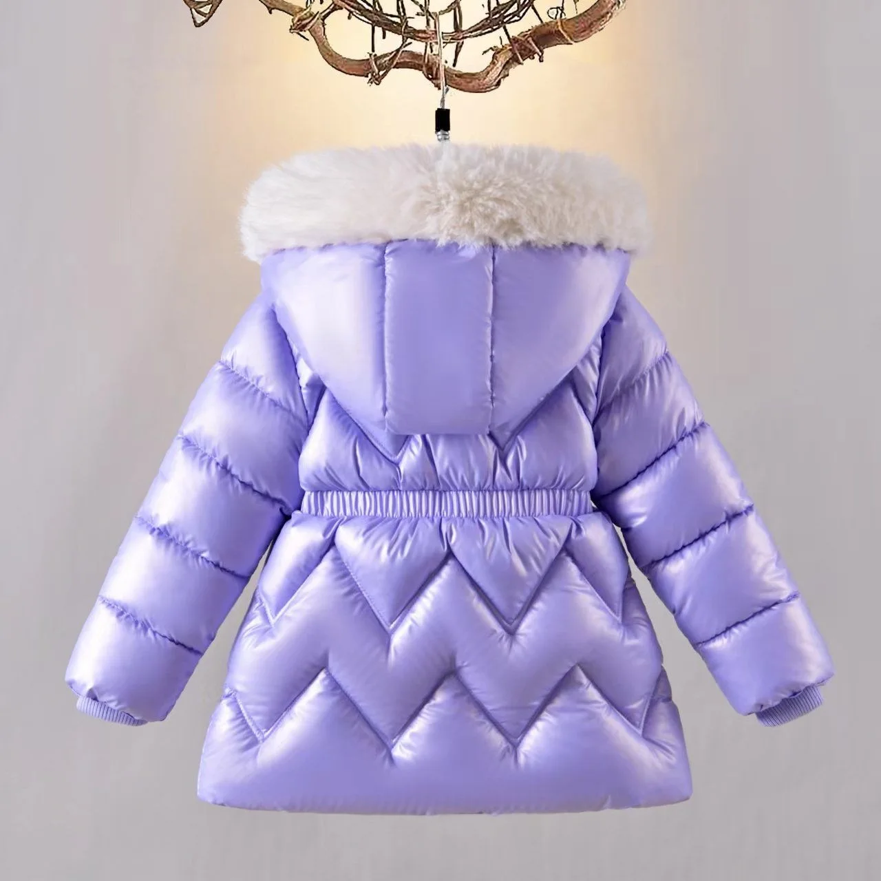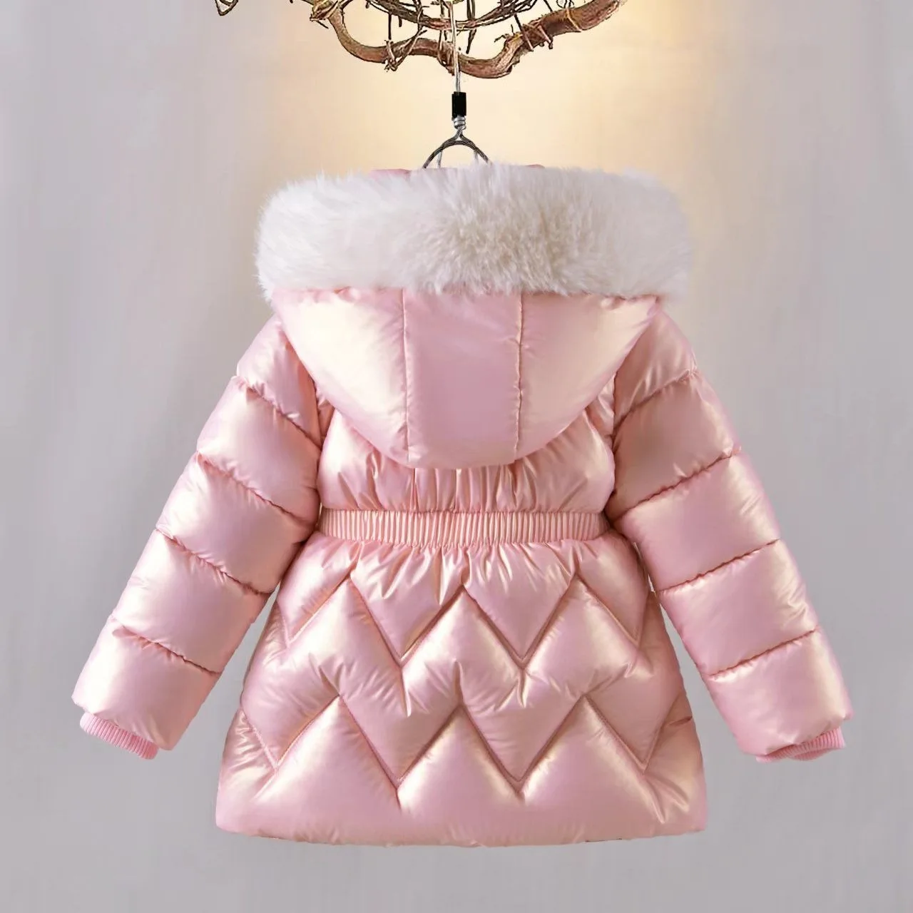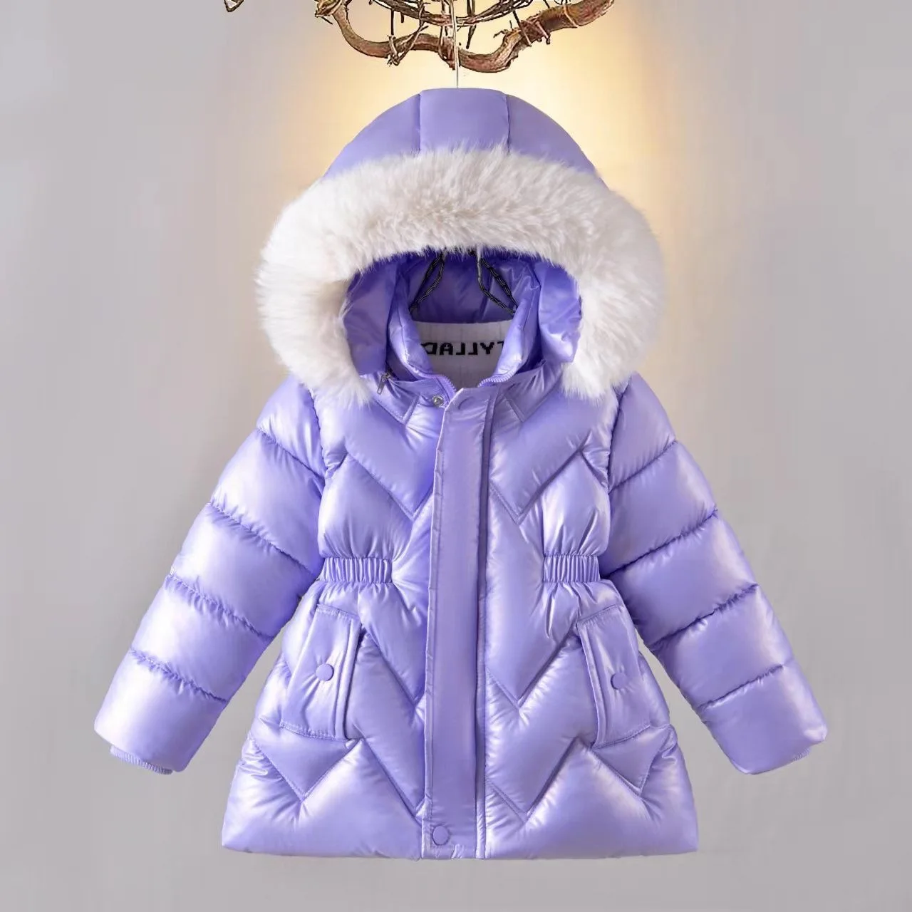 2025 Giacca invernale per ragazze Fodera in tinta unita Peluche spesso caldo lucido Parka con cappuccio impermeabile per ragazze 4-8 anni Tuta da neve in cotone
