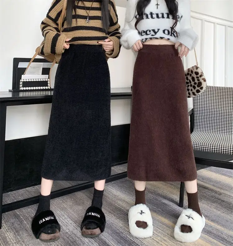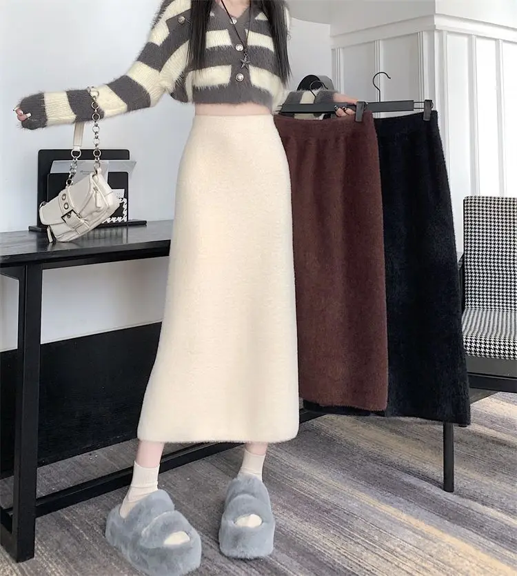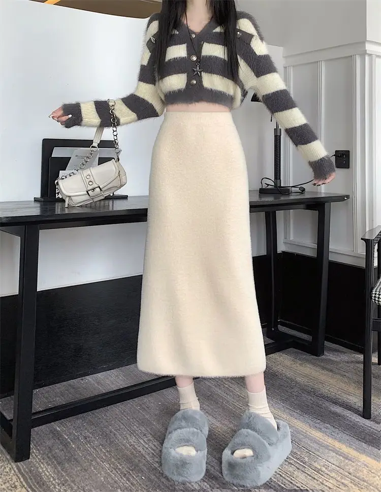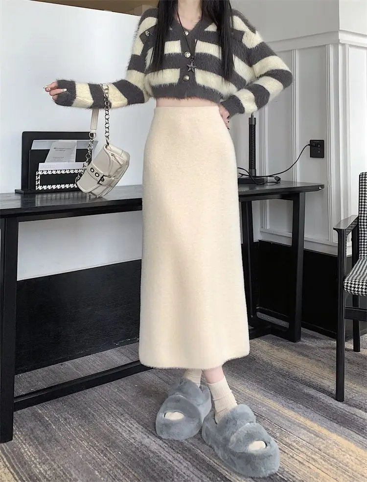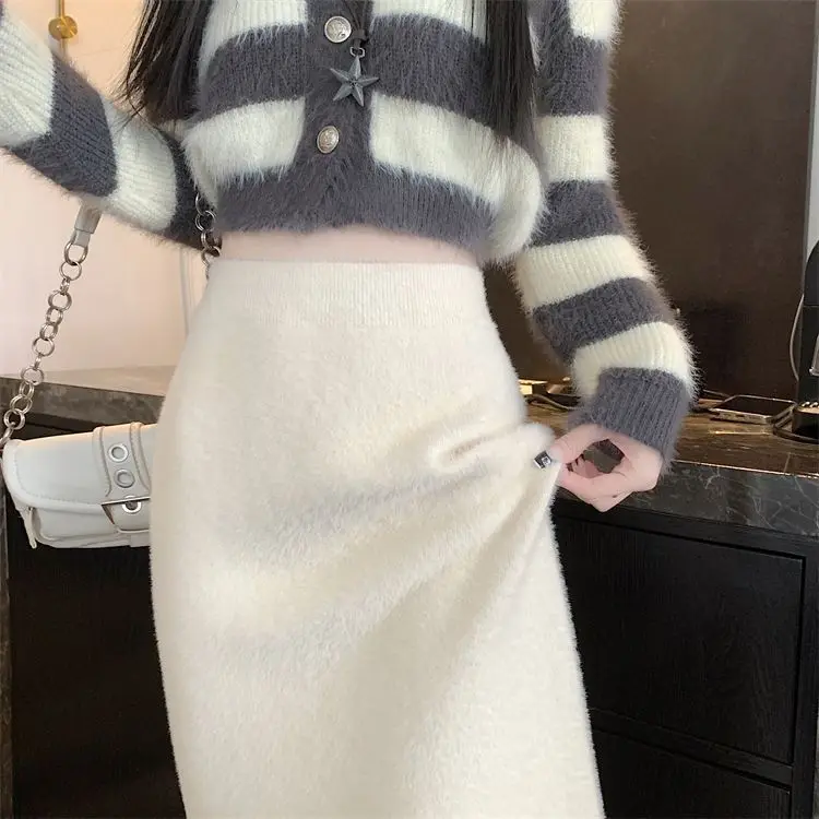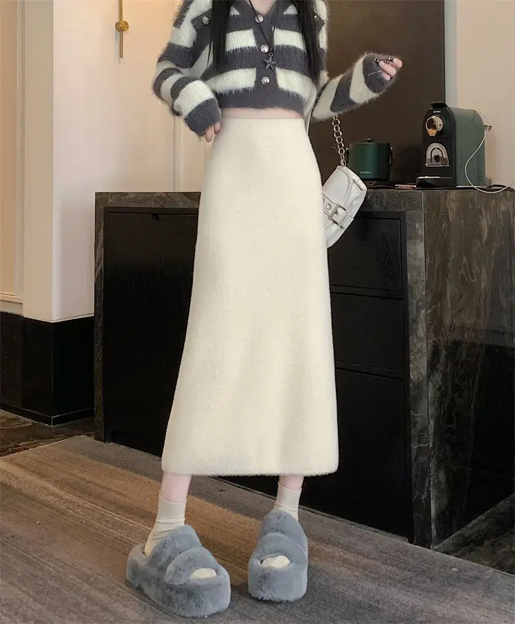 2025 Gonna lavorata a maglia invernale con spacco di media lunghezza a vita alta dolce autunno e inverno