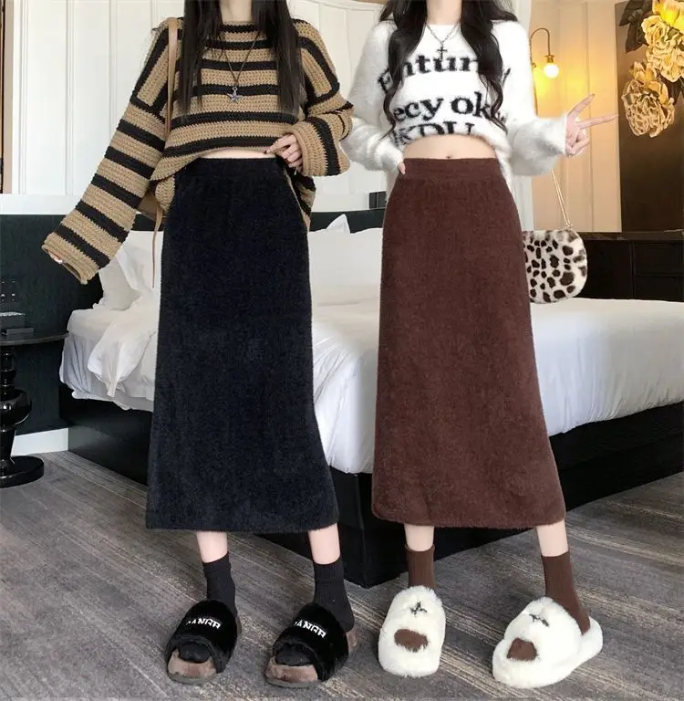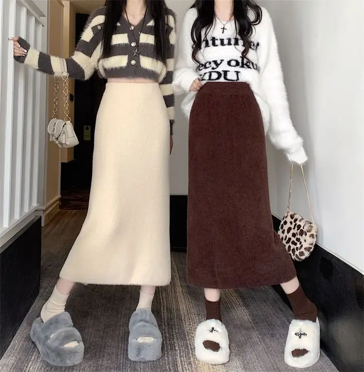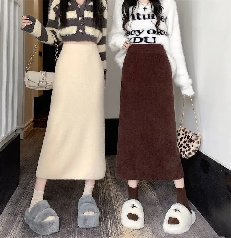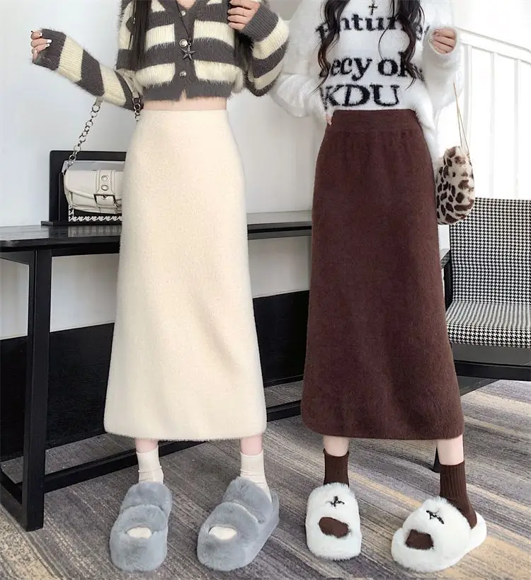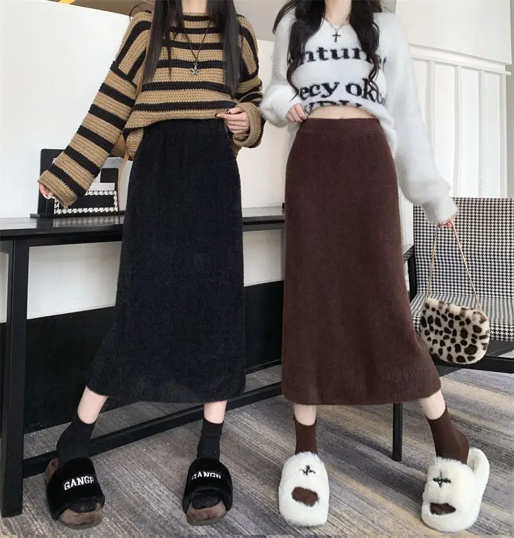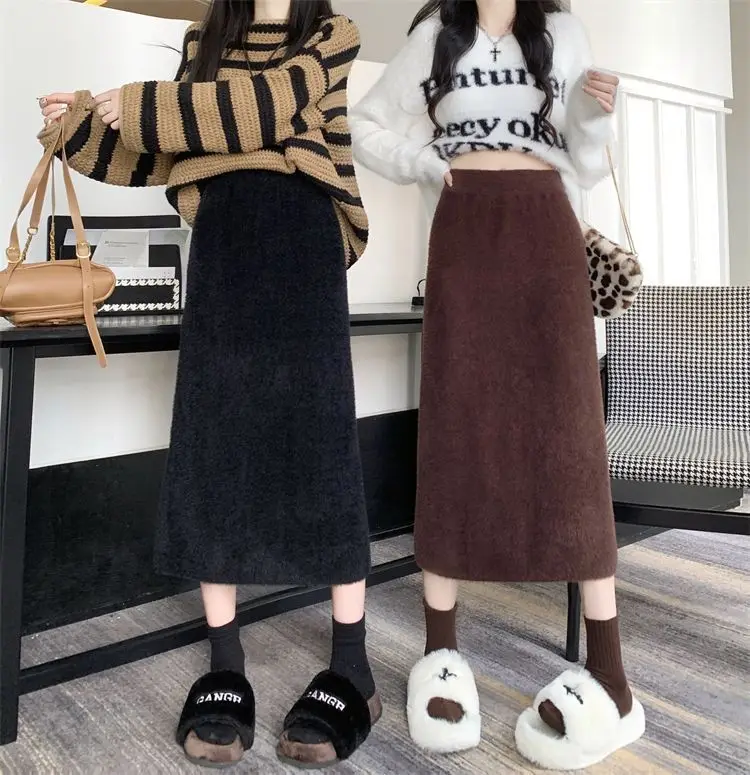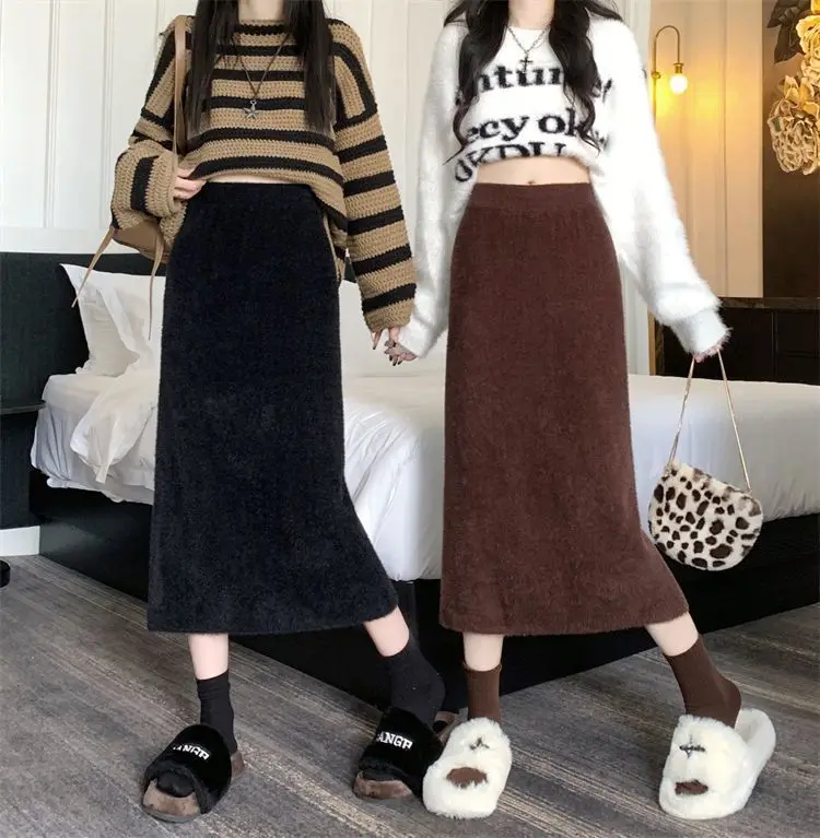 2025 Gonna lavorata a maglia invernale con spacco di media lunghezza a vita alta dolce autunno e inverno
