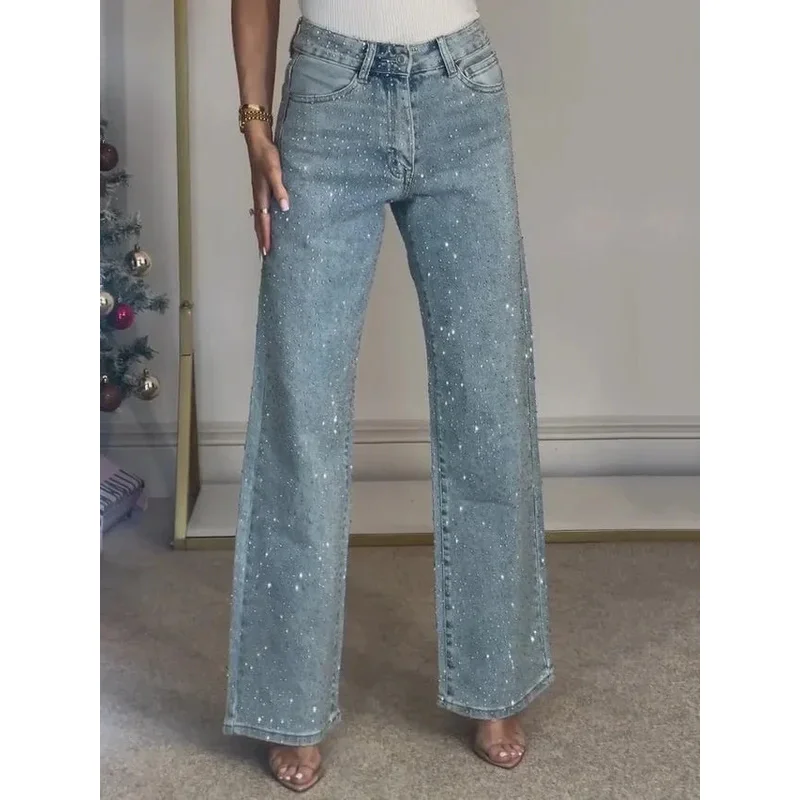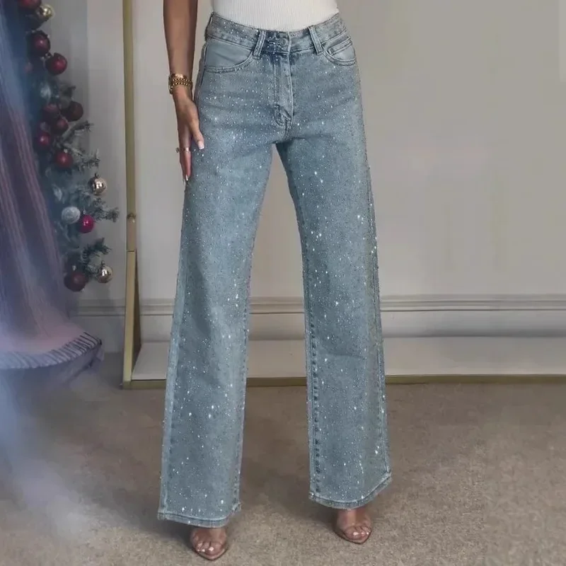 2025 Jeans da donna Pantaloni dritti con diamanti Pantaloni elasticizzati a vita alta lavati Jeans mamma Y2k Pantaloni streetwear Denim vintage Streetwear