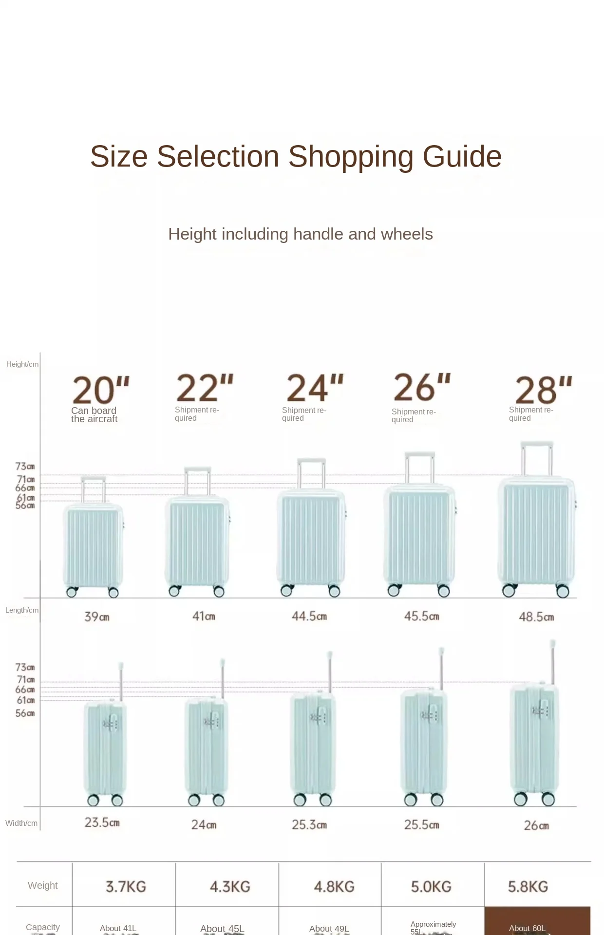 (3) Le specifiche SKU sei selezionate durante il posizionamento dell’ordine riflettono le dimensioni accurate della valigia. Le dimensioni stampate sulla scatola da imballaggio potrebbe diverse, come la stessa scatola possono essere utilizzate per più modelli di valigie. Per favore non preoccuparti.