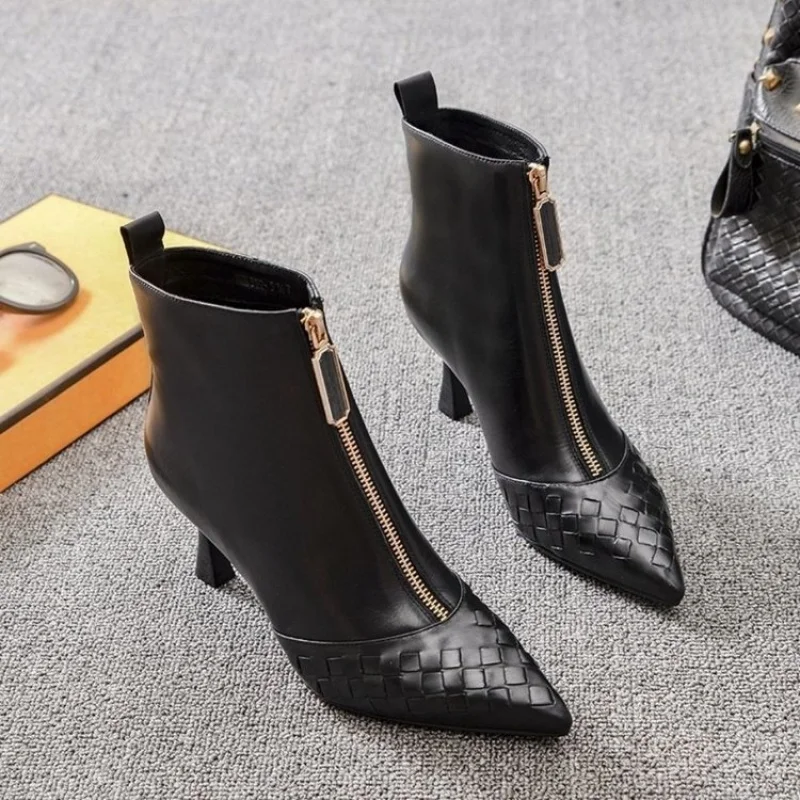 2025 Nuovi stivaletti alla moda da donna – Stivaletti trapuntati in pelle lucida nera con cerniera frontale e tacco medio, stivali invernali slim fit