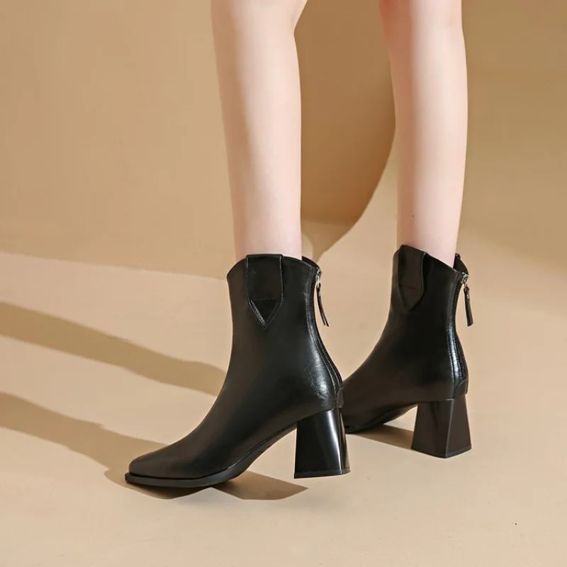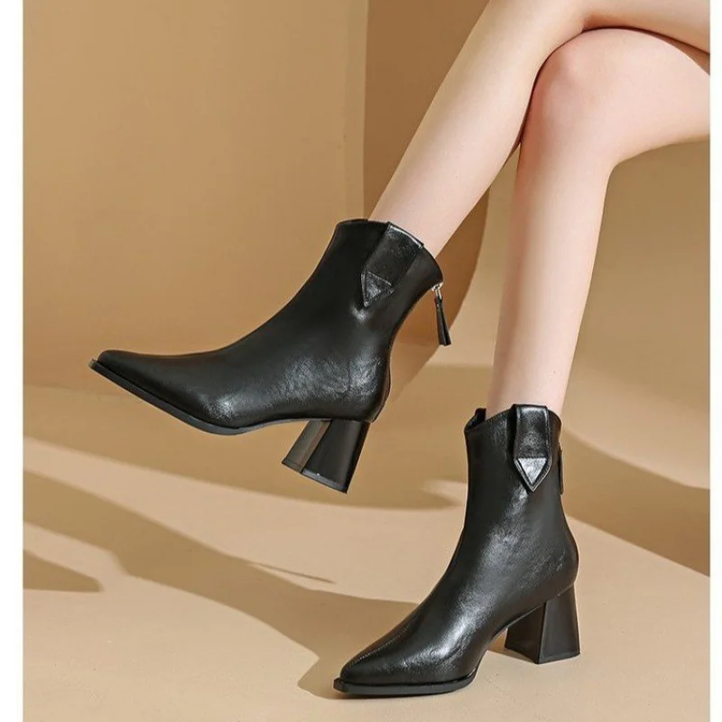 2025 Nuovi stivaletti in pelle con tacco grosso da donna – Stivaletti alla moda slim fit con tacco medio, stivali corti autunno/inverno per donna