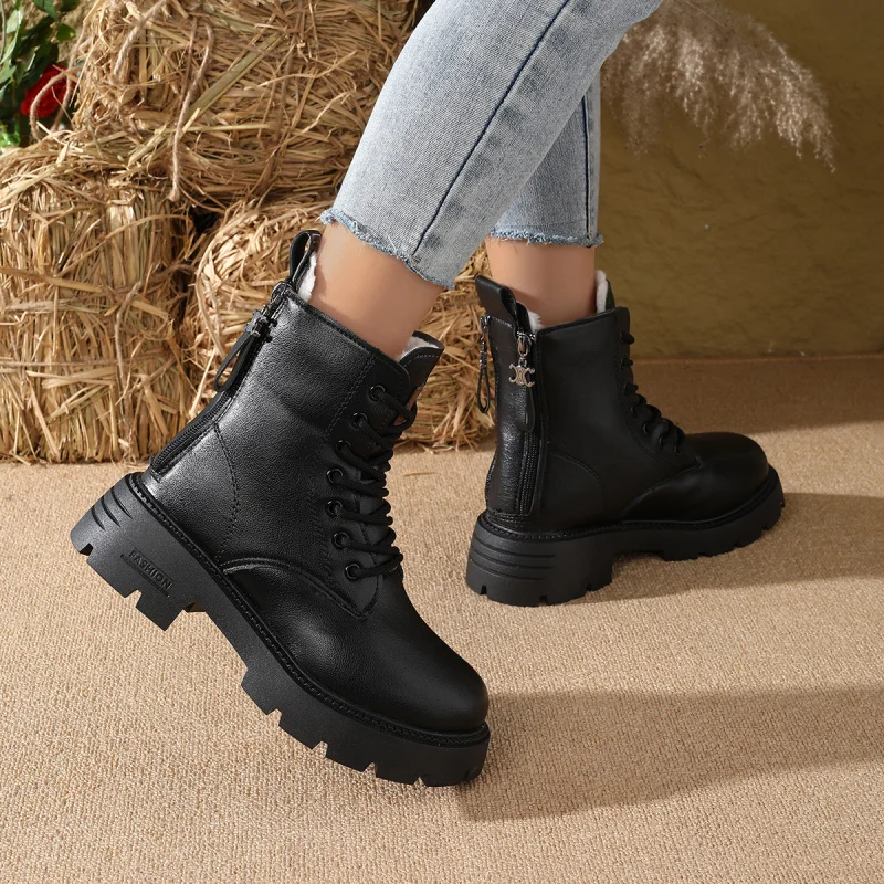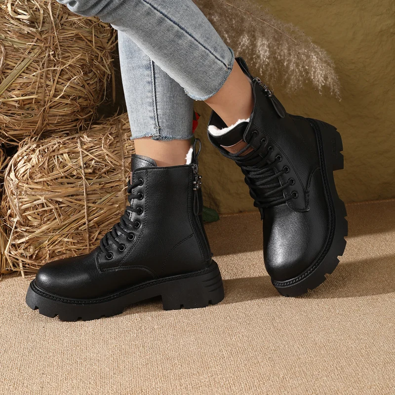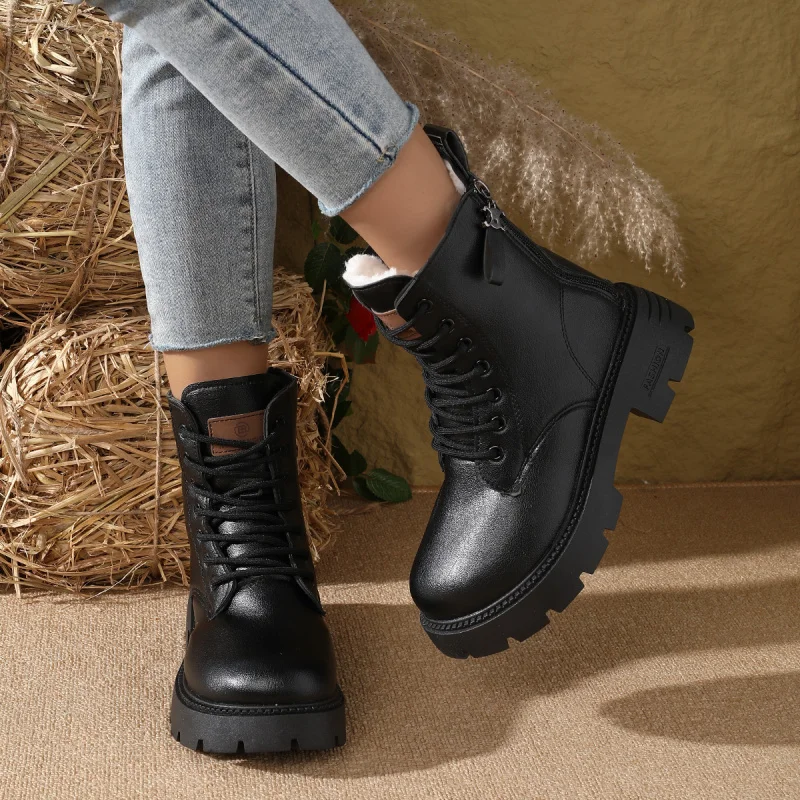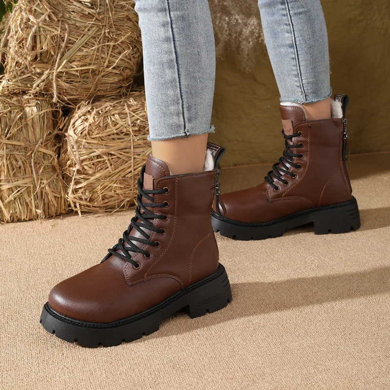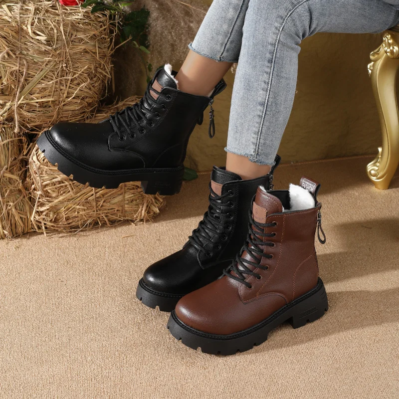 2025 Nuovi stivaletti invernali da donna – Stivaletti con tacco medio stringati in morbida pelle Stivali retrò con plateau stile britannico foderati in pelliccia sintetica