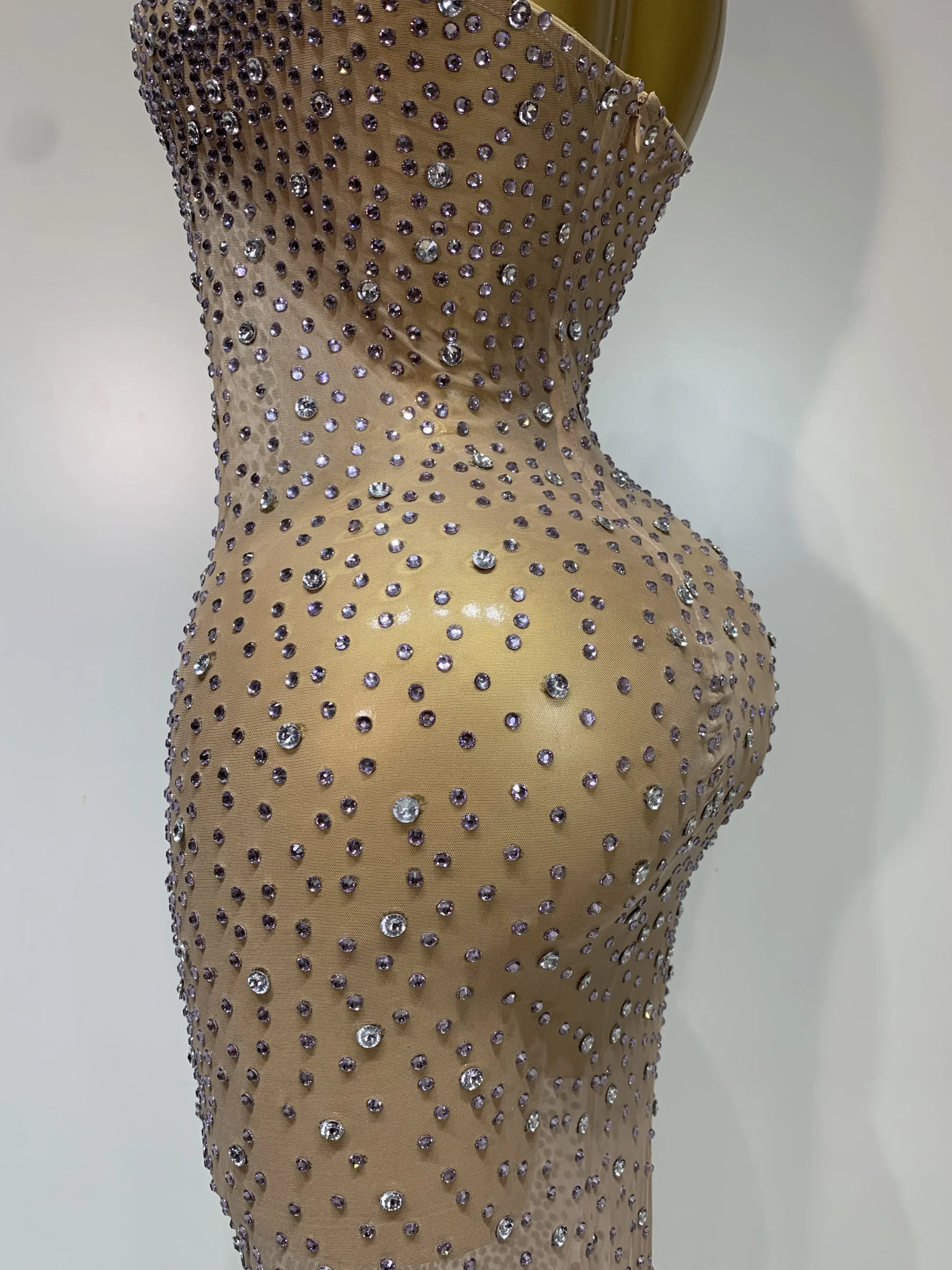 2025 Nuovo abito lungo trasparente in rete senza maniche Abito sexy con strass scintillanti senza schienale Abiti da sera per festival di celebrazione