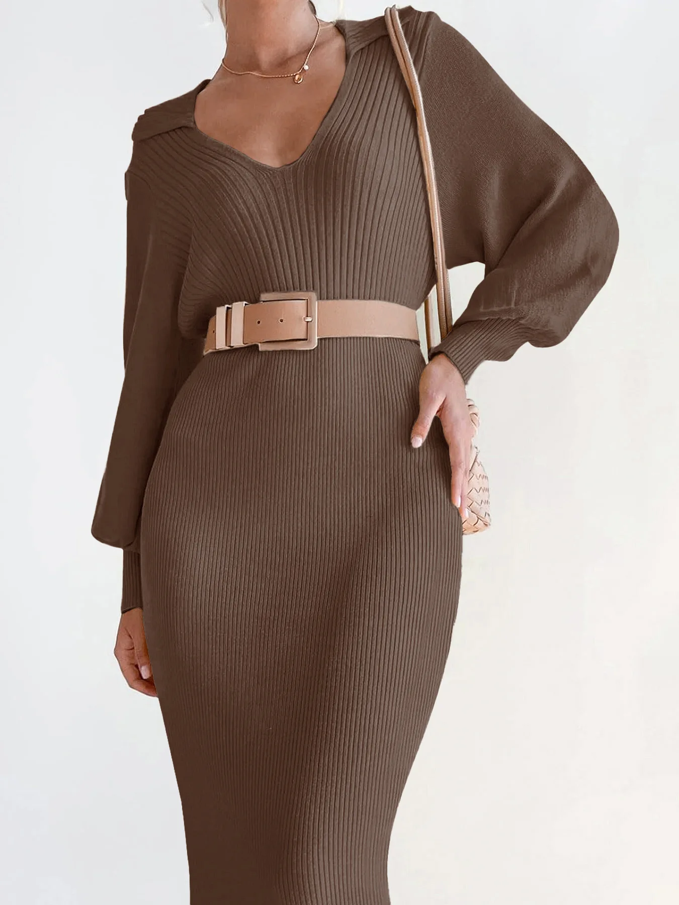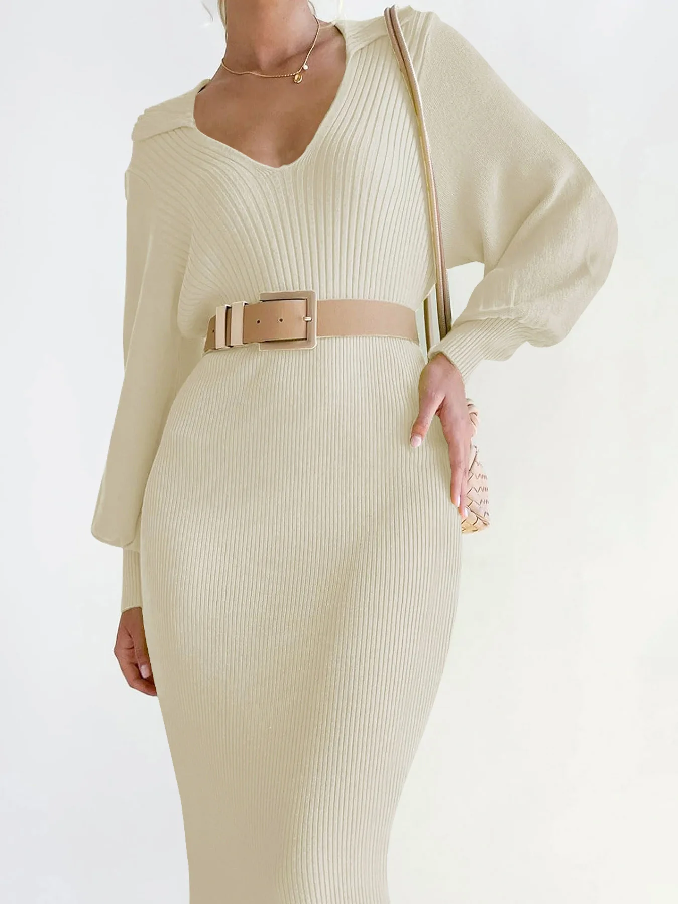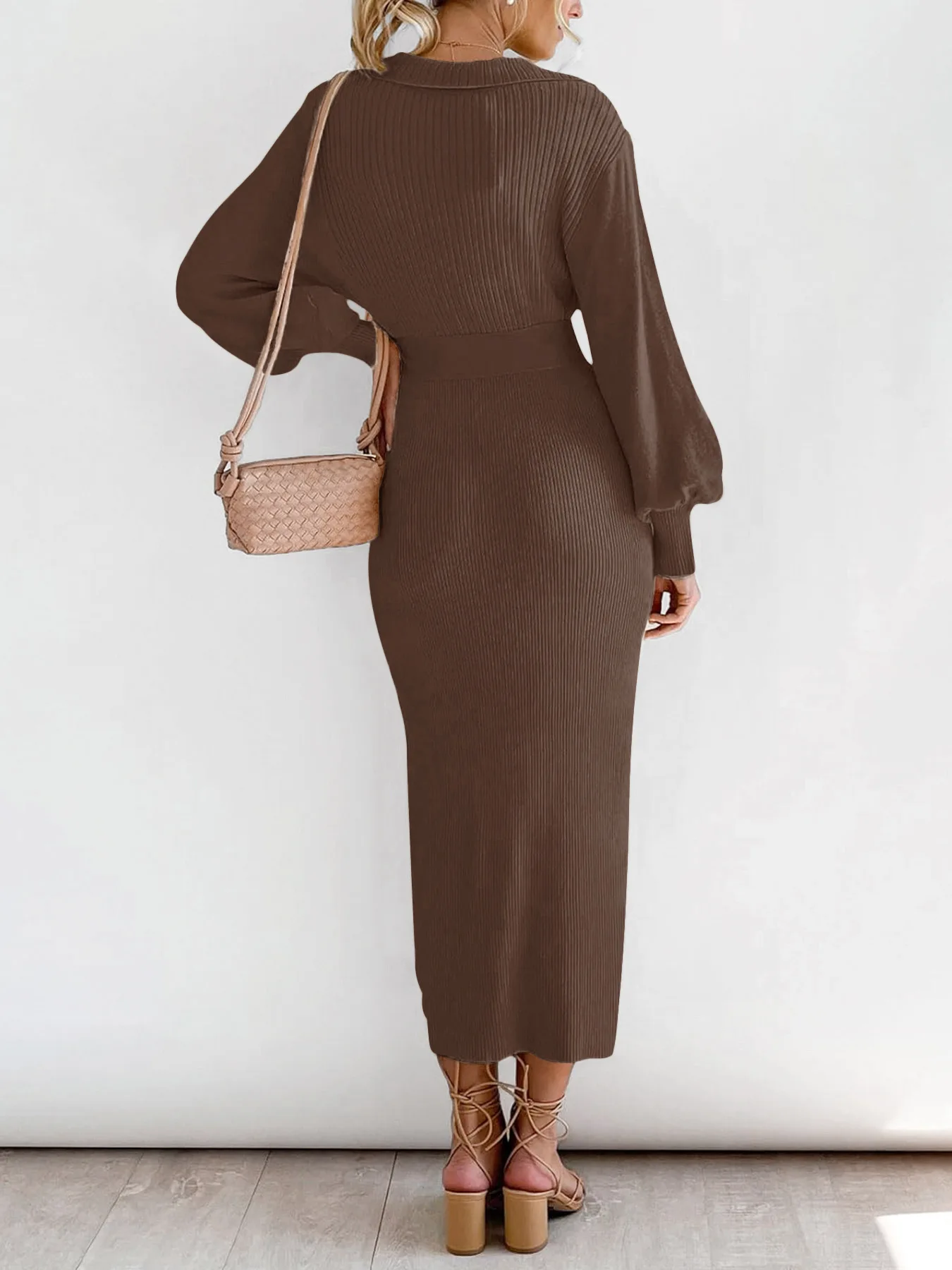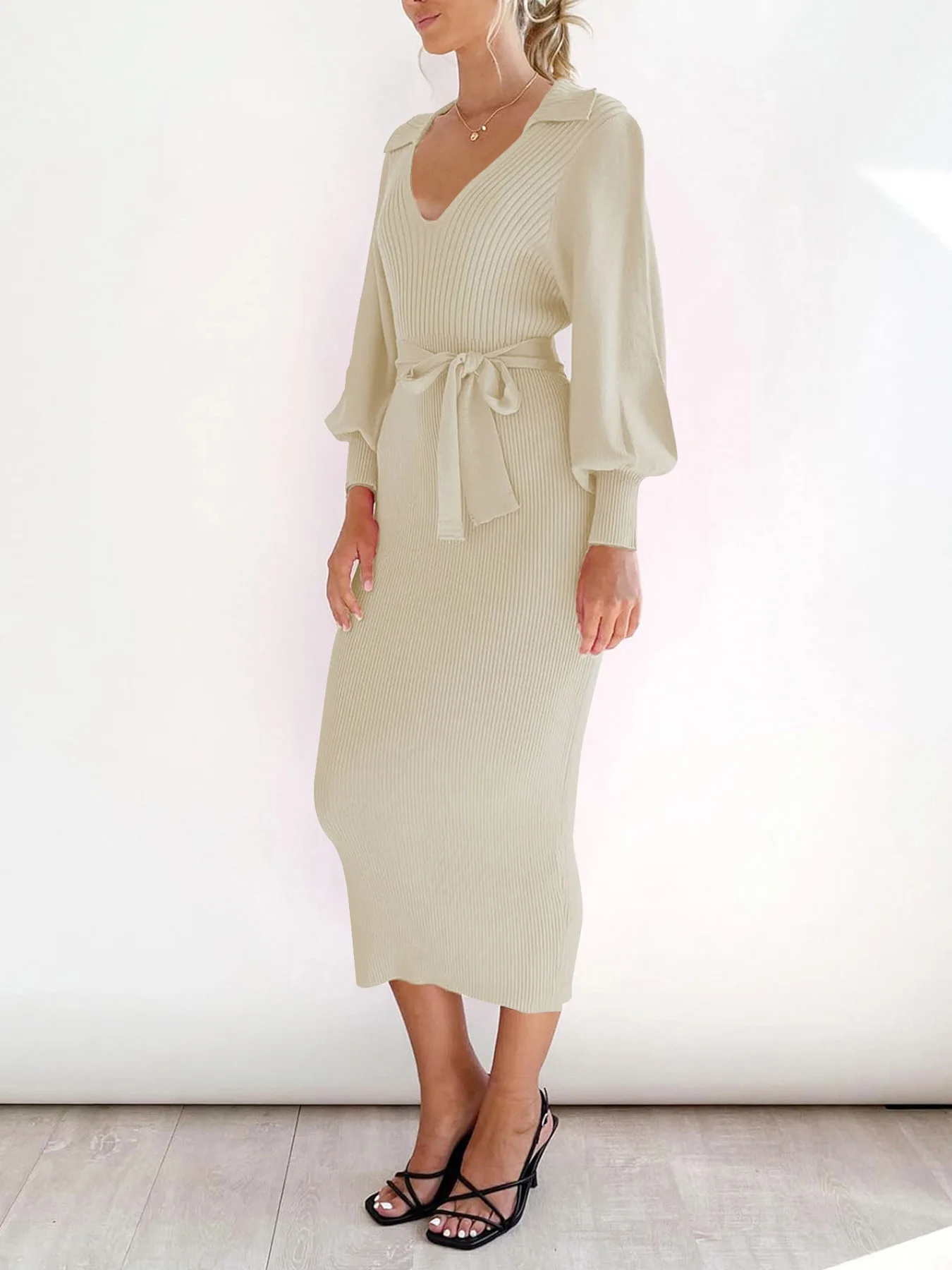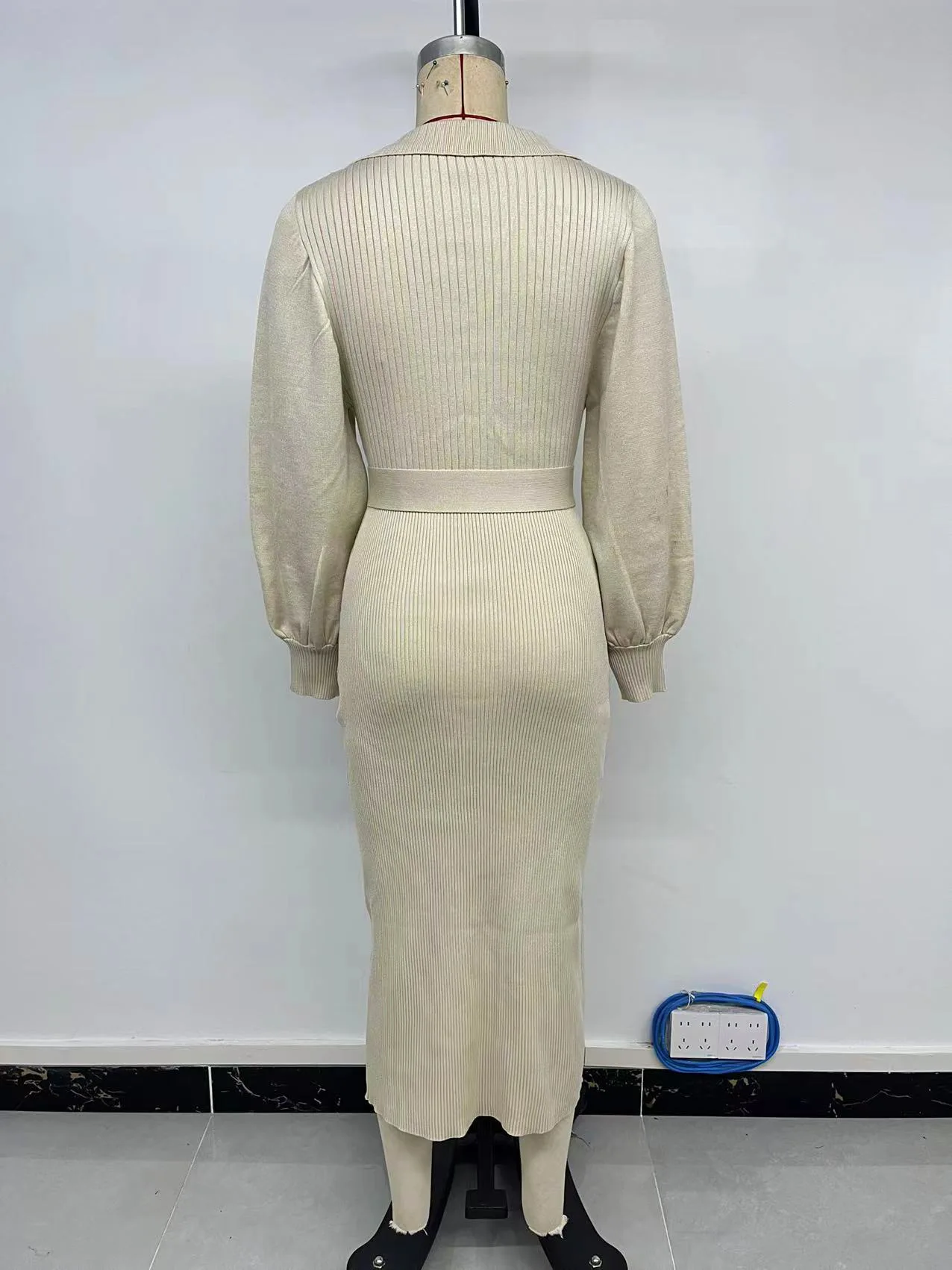 2025 Nuovo autunno e inverno elegante retrò leggero stile maturo maniche a lanterna scollo a V gonna maglione lavorato a maglia tinta unita