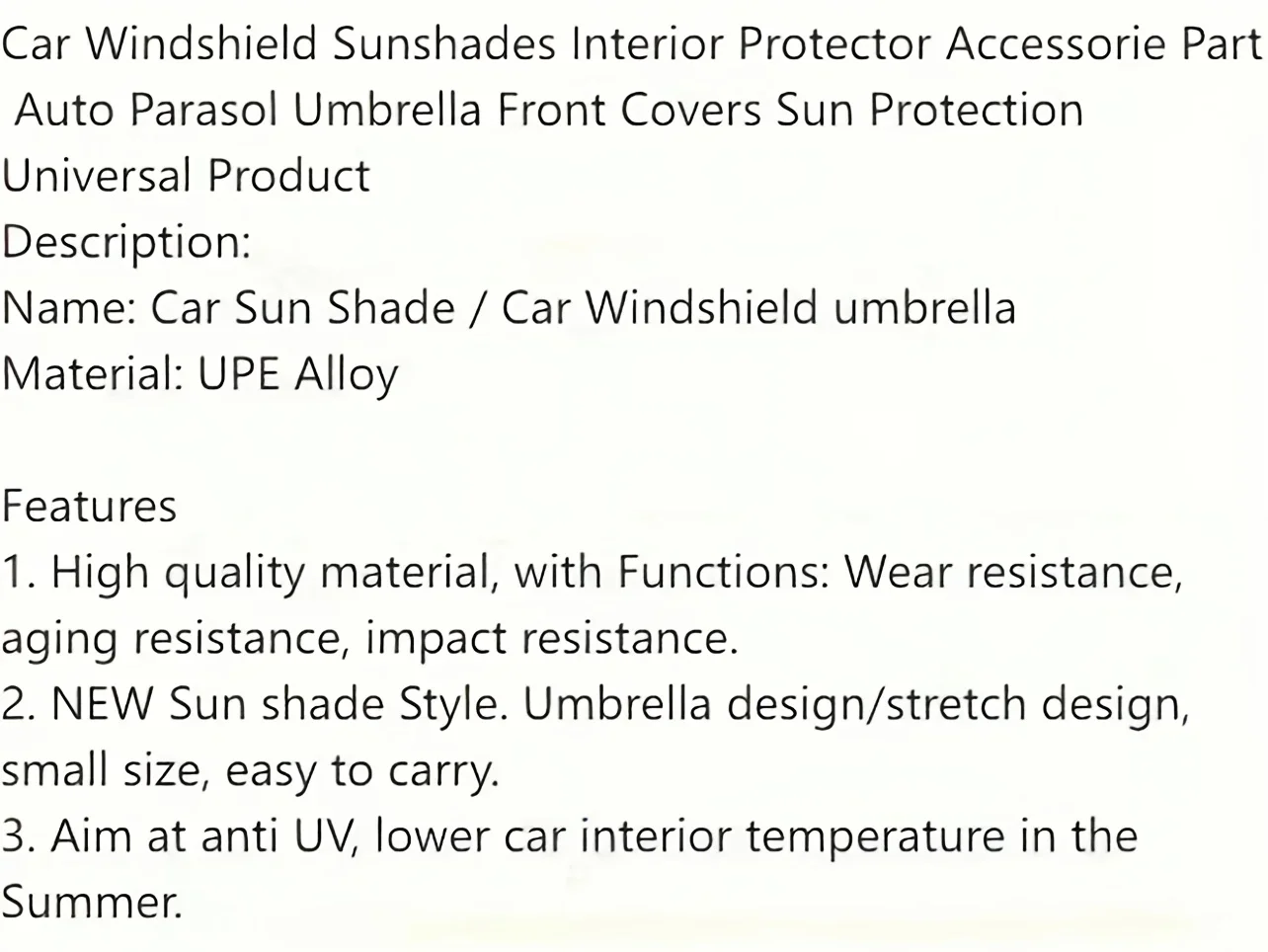 Efficace blocco UV Tutti i nuovi tessuti in poliestere densi aggiornati con rivestimento riflettente bloccano efficacemente i raggi UV e il calore per proteggere l’interno della pelle.Eccellente protezione solare e isolamento termico Tagli completamente del percorso di conduzione del calore per bloccare, cadere di temperatura fino a 16 gradi.Spiega la cabina del Sun Bat a forma di ala con design pieghevole offre un’area di ombreggiatura più ampia per un migliore isolamento termico.Bordi morbidi con orlo Nessuna luce piscierà intorno ai bordi e non graffiare l’interno o il vetro.Materiale più leggero, la costine in fibra di vetro più resistente è molto più robusta con un supporto migliore, realizzata per durare.Ampia compatibilità Realizzato su misura per adattarsi a vari modelli di auto.Materiale ecologico Il materiale PET rinnovabile sicuro e inodore offre una affidabilità prolungata e è certificato RoH.Multi-Scenario Applicabile Mantieni la cabina fresca e protegge la privacy e l’interno.Super facile da usare 1.Apri il ombrellone dell’auto.2.Impostalo dietro il parabrezza.3.Lascia che le protezioni parasole del parabrezza dei sedili del conducente e del passeggero per fissare l’ombrellone.Titolo del prodotto: 2024 Parabrezza per auto Parasole Ombrello Parasole pieghevole Copertura per lunotto anteriore per protezione termica con blocco raggi UV Caratteristiche dell’ombrole:Efficace blocco raggi UV: Progettato per bloccare i raggi UV nocivi, previene danni all’interno dell’auto e mantenere fresco.Protezione termica: riflette il calore e riduce la temperatura all’interno della tua auto, offre un’esperienza di guida più comoda.Pieghevole e facile da riporre: questo ombrellone si piega facilmente, ti consentono di riporrelo nella tua auto senza prendere molto spazio.Vestibilità universale: Adatto per la maggior parte dei veicoli, da piccole auto a SUV e camion.Materiale durevole: realizzato in materiale di alta qualità e resistente al calore per un uso duraturo.Installazione semplice: semplice da aprire e installare sul parabrezza anteriore dell’auto, rendendo una soluzione rapida per la protezione solare.Descrizione del prodotto: Mantieni il tuo auto fresco e protetto con il ombrellone parasole per parabrezza dell’auto 2024.Progettato per bloccare i raggi UV nocivi e riflettono il calore, questo parasole pieghevole è un accessorio indispensabile per qualsiasi proprietario del veicolo.Il design in stile ombrello rende facile da aprire e installare sul parabrezza anteriore, protegendo l’interno dell’auto dai danni al sole e riducendo la temperatura all’interno.Il design leggero e pieghevole dell’asole significa che può essere memorizzato comodamente quando non utilizzato, prendi spazio minimo nella tua auto.Realizzato con materiali durevoli e di alta qualità, fornisce una protezione affidabile contro il sole come facile da maneggiare.Perfetto per auto, SUV, camion e altro ancora, questo parasole garantisce il tuo veicolo sta fresco e confortevole anche nei giorni più alla moda.Perché ci scegliere:Materiali di alta qualità: utilizzati solo materiali di alta qualità e resistenti al calore per garantire la massima durata e la protezione.Vestibilità universale: il nostro parasole pieghevole è progettato per adattarsi alla maggior parte dei modelli di auto, garantendo protezione ottimale del tuo veicolo.Cliente-Centrico: siamo commissionati a fornire servizio clienti di prima livello, garantire che sei completamente soddisfatto dell’acquisto.Compatto e portatile: pieghevole e leggero, è facile da riporre e trasportare, rendendo comodo per l’uso quotidiano.Recensioni da altri clienti: 1.”Questo parasole è sorprendente!Piega come un ombrellone, così è super facile da riporre.Conserva davvero la mia auto fresca e protegge il mio interno.Consigliamo altamente!”–★★★★★ — Jessica Brown 2.3.”Grande prodotto!Il parasole si adatta perfettamente al mio SUV e è un ottimo lavoro che blocca il calore e dai raggi UV.Facile da usare e piegare.”–★★★★★ — David Lewis 4.5.”Très bon produit!Facile all’installatore e un ranger.Protetto bene contro le raggi UV e la calore.Je recommande.”–★★★★☆ — Pierre Martin 6.7.”Questo parasole è incredibile!Lo è usato durante todo el verano, y mantiene mi coche mucho más affresco.Facile de usar e almacenar.”–★★★★★ – Carlos Lopzo 8.