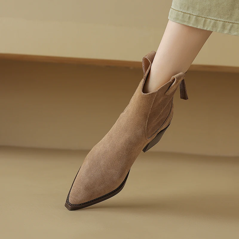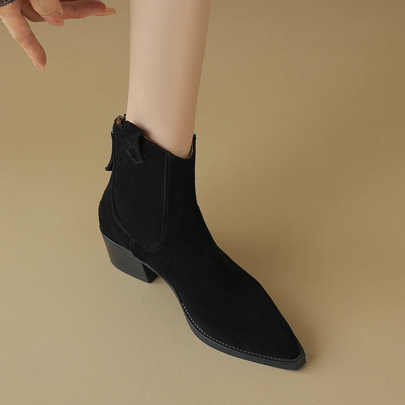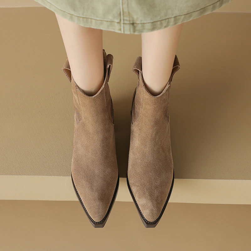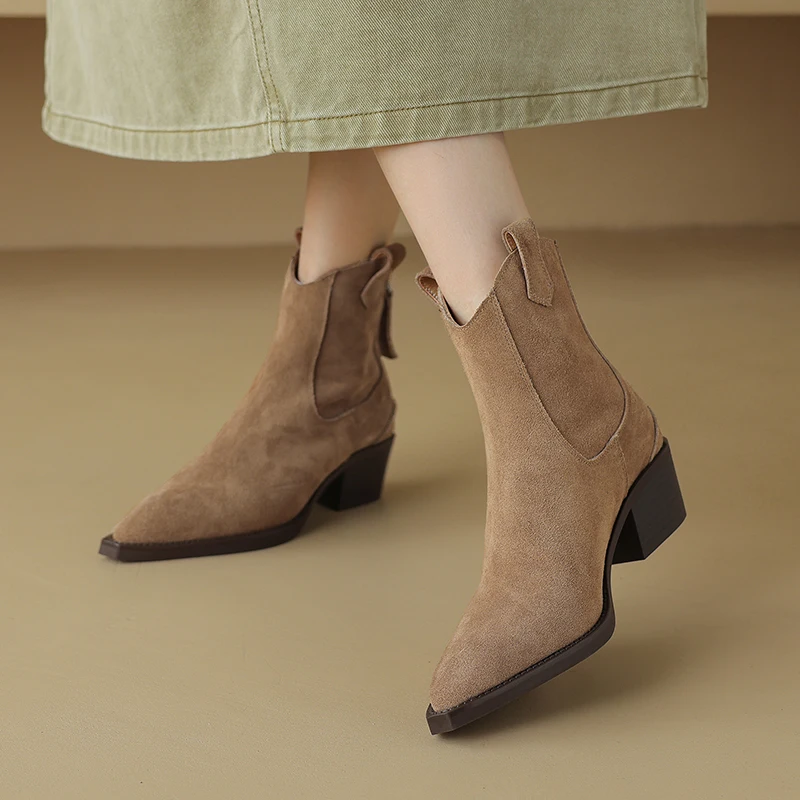 2025 Stivaletti Chelsea classici invernali da donna Stivaletti con zeppa in pelle scamosciata di mucca con punta a punta Stivaletti da cowboy semplici e comodi da donna