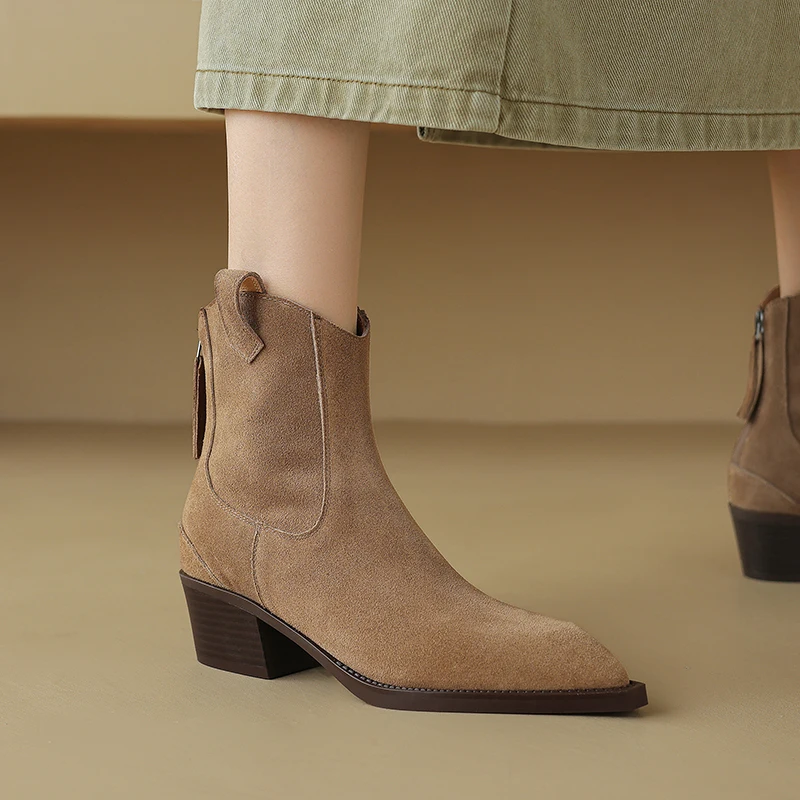 2025 Stivaletti Chelsea classici invernali da donna Stivaletti con zeppa in pelle scamosciata di mucca con punta a punta Stivaletti da cowboy semplici e comodi da donna