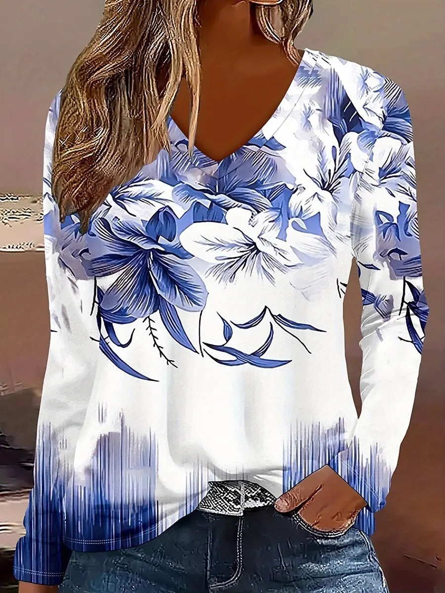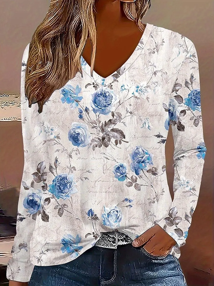 2025 T-shirt da donna Piante grafiche floreali T-shirt eleganti alla moda con scollo a V T-shirt a maniche lunghe Top regolari Pullover Autunno Inverno