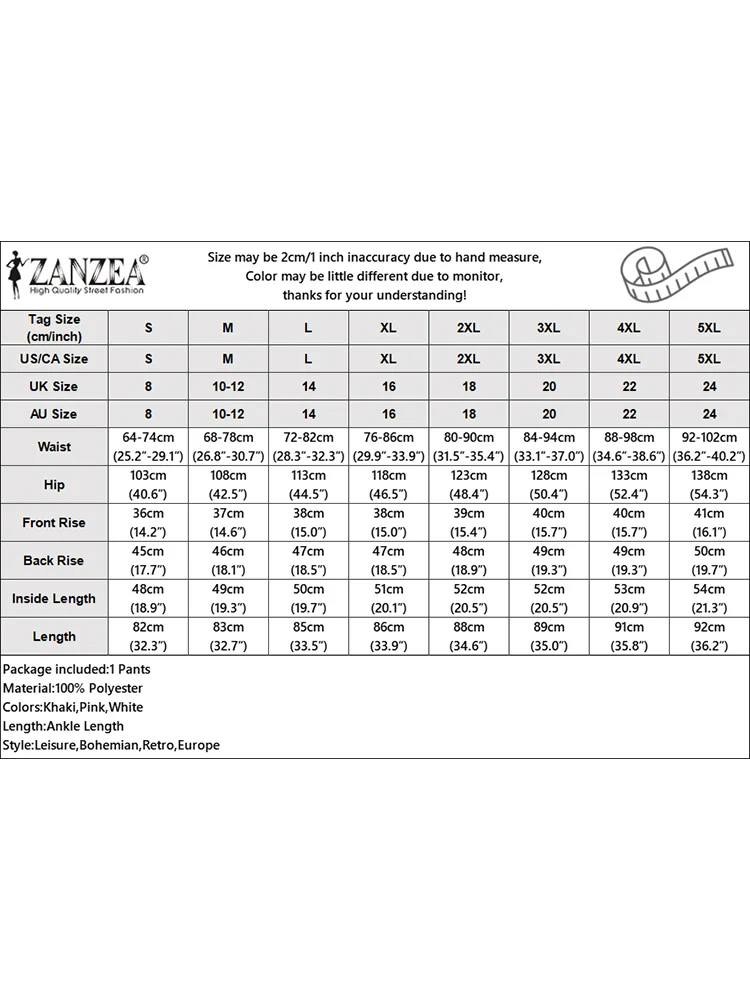 Il pacchetto include: 1 pantalone Materiale: 100% poliestere Colori: kaki, rosa, bianco Modello: tinta unita Lunghezza: lunghezza della caviglia Girovita: elastico in vita Spessore: sottile Decorazione: tasche laterali, tasche posteriori Stile: tempo libero, bohémien, retrò, Europa Stagione: primavera, estate, autunno, inverno Occasione: famiglia, festa, spiaggia, matrimonio, vacanza Etichetta: sì Attenzioni: 1.L’oggetto reale può presentare leggere differenze di colore rispetto alle immagini visualizzate su computer diversi. Attenzione se ti dispiace, grazie. 2. Potrebbe esserci un errore di misurazione manuale di 1-3 cm. Ci scusiamo per qualsiasi inconveniente. 3.Si prega di prevalere sull’oggetto reale, sulle immagini del modello solo come riferimento. 4.Attenzione!! !Si prega di controllare attentamente la tabella delle taglie prima di effettuare l’ordine.