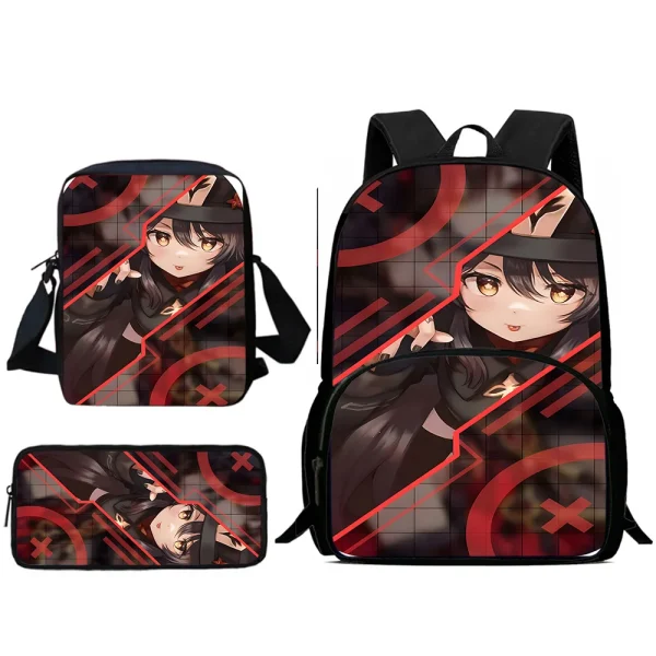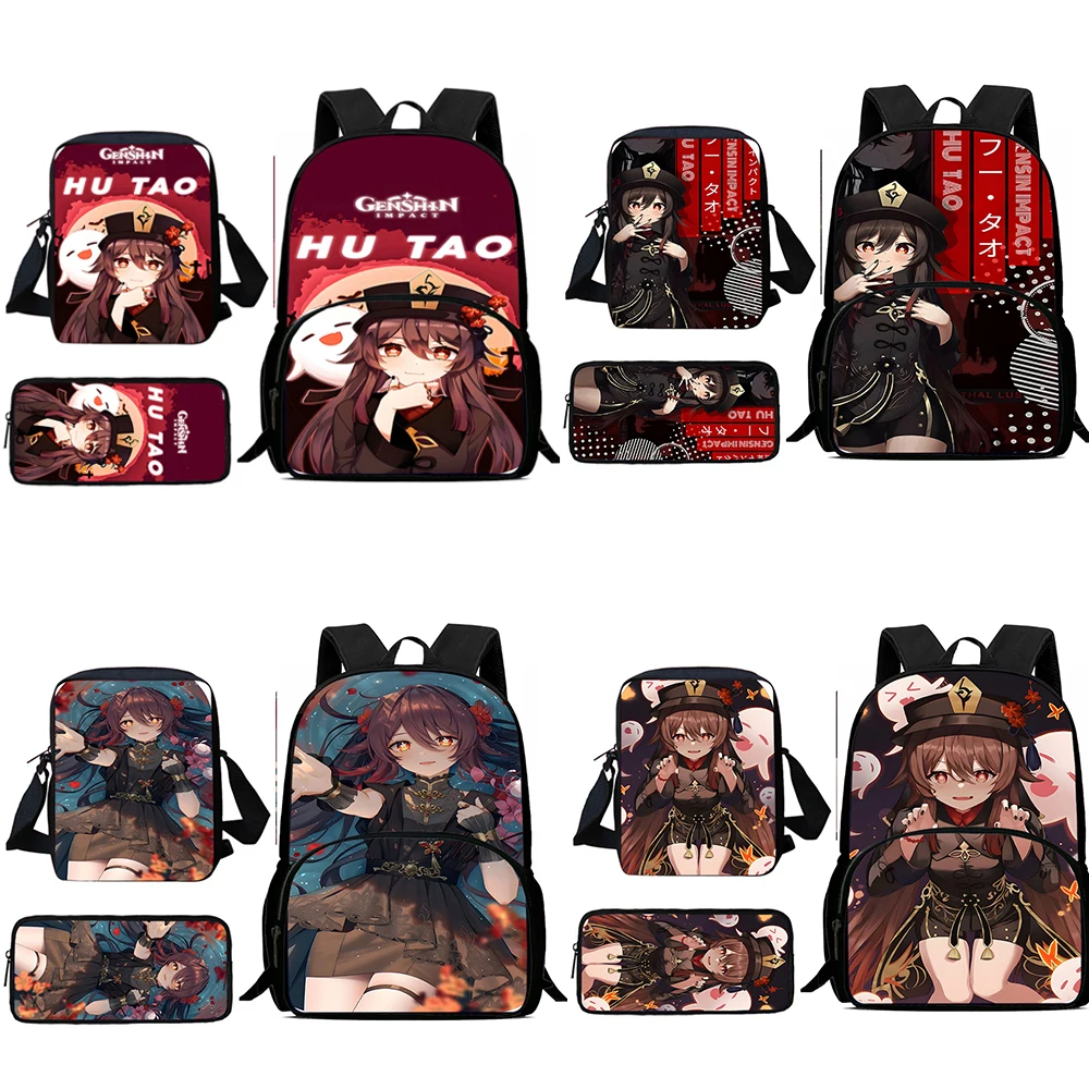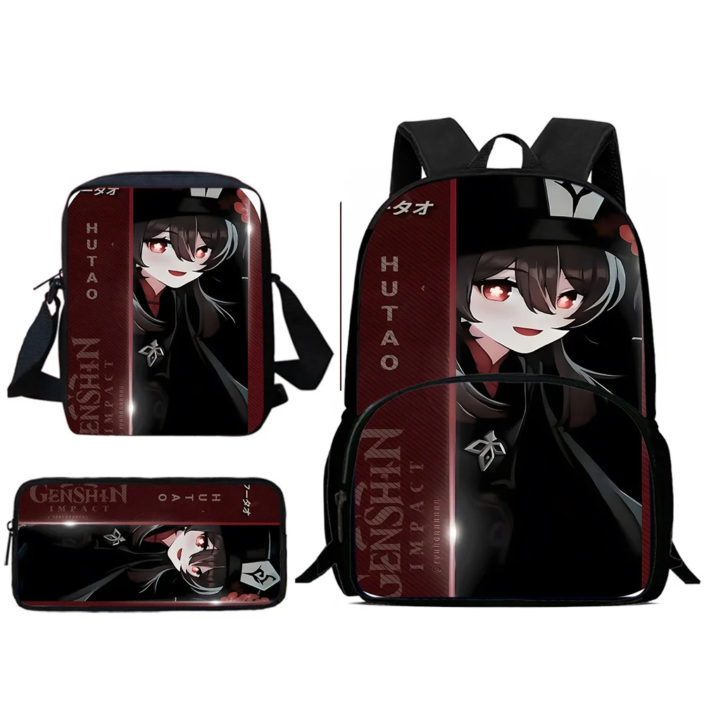 3 pezzi Set bambino Hu Tao Genshin Impact zaini borsa a tracolla astuccio per matite pupilla borsa da scuola di grande capacità per ragazzi e ragazze miglior regalo