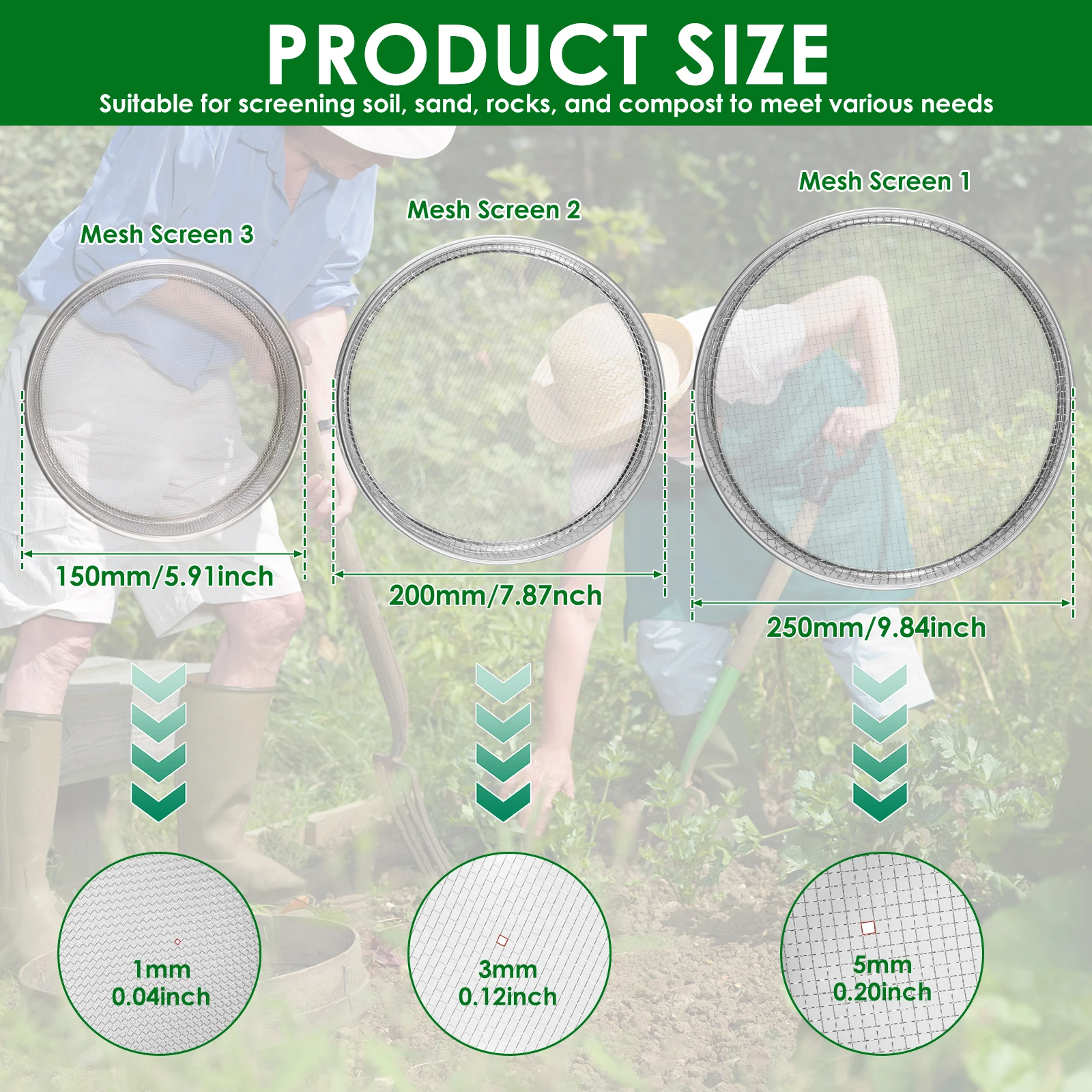 Set Include: questo pacchetto contiene 3 diverse dimensioni di setaccio per terreno, il diametro generale è di 25 cm, 20 cm e 15 cm, e il diametro della rete è di 5 mm, 3 mm e 1 mm, adatto per setacciare il terreno, sabbia o rocce, soddisfa una varietà di esigenze