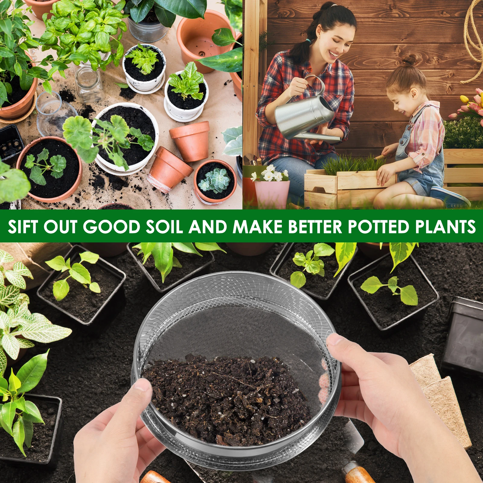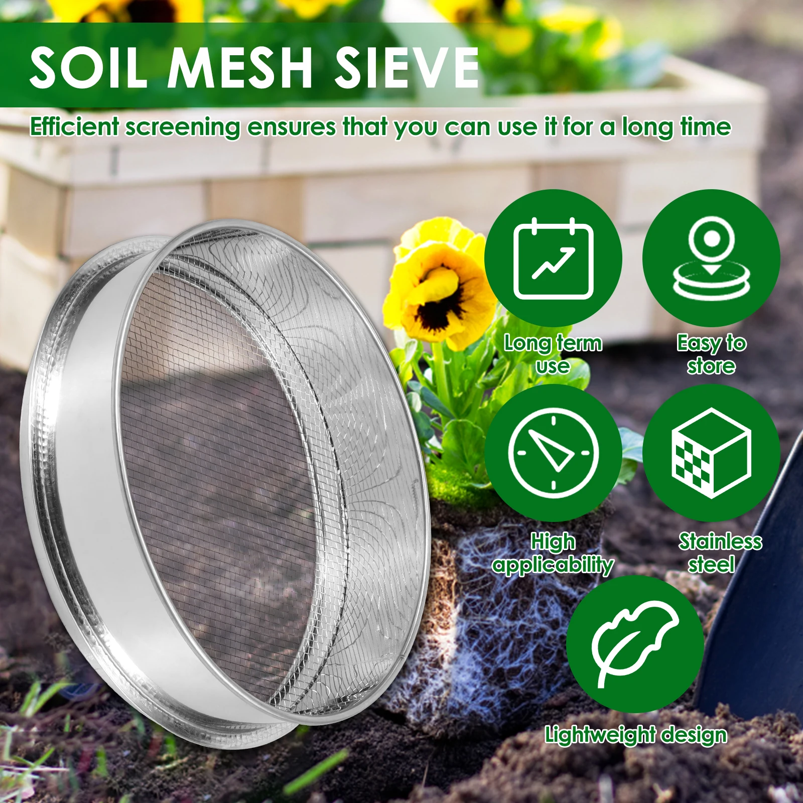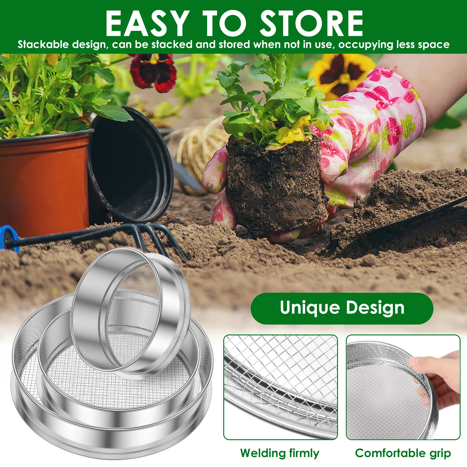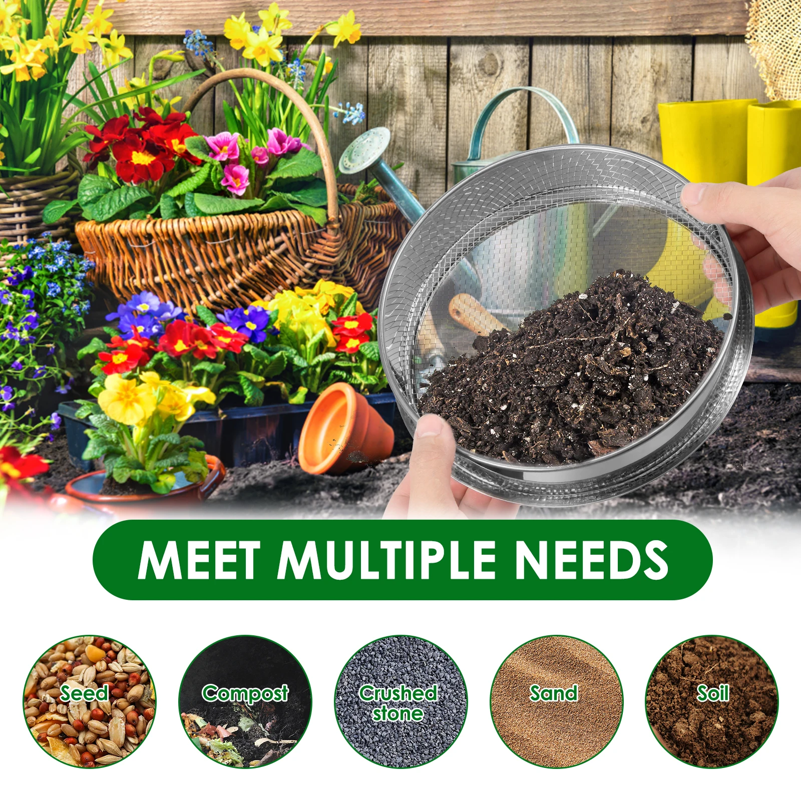 Texture duratura: questo set di setaccio da giardino è realizzato in acciaio inossidabile, robusto e duraturo, non facile da deformare, può essere schermato in una varietà di ambienti per soddisfare le esigenze di uso quotidiano
