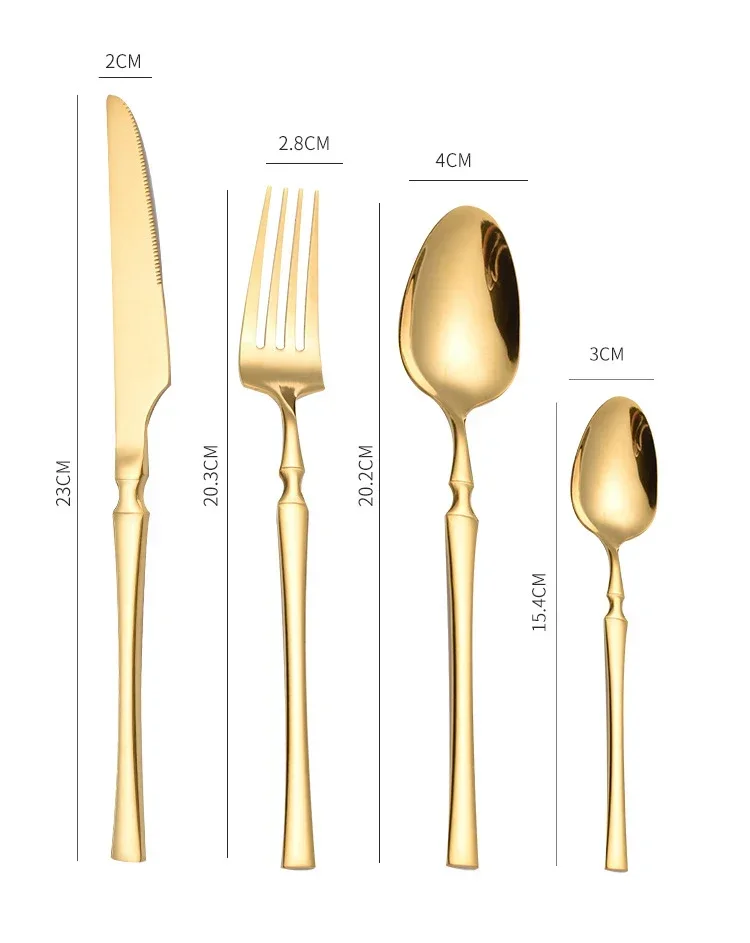 Lunghezza coltello da cena: 22,5 cm —————————————————— Lunghezza cucchiaio da tavola: 19,5 cm —————————————————— Lunghezza forcella da cena: 19,5 cm —————————————————— Lunghezza del cucchiaio da tè: 15 cm —————————————————— Lunghezza forchetta da tè: 15,5 cm ———————————————————— Confezione: scatola ——————————————————- Materiale: acciaio inossidabile ——————————————————- Occasioni applicabili: matrimonio, festa, festa della mamma, festa dei bambini, Natale, famiglia, ristorante, clubhouse, ecc.