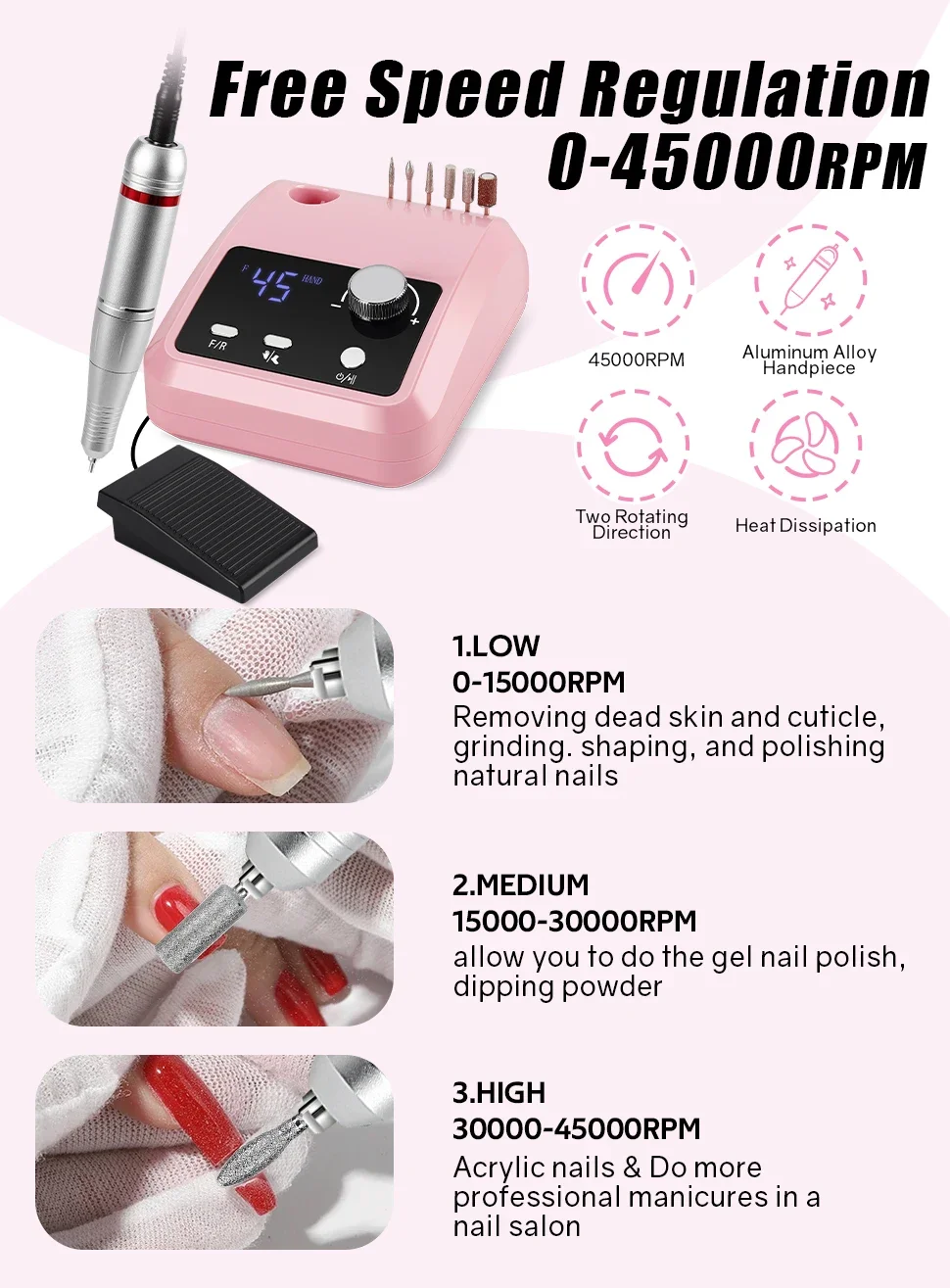 【Lime per unghie elettrica efficiente 0-45000 giri/min】: un motore significativamente più potente, un trapano per unghie compatto è progettato con velocità regolabile, viene con un manopola di controllo, facile per cambiare la velocità subtilmente da 0-45.000 giri/min.Il kit di file elettrici non perde potere durante la archiviazione di chiodi acrilici duri con un coppia elevata.Dì addio agli chiodi alla perforatrice per unghie flimsy a bassa potenza!Una punta: i principianti consigliano per iniziare l’utilizzo di prima velocità!