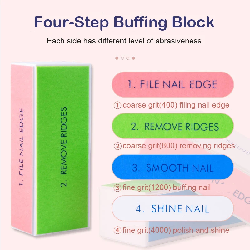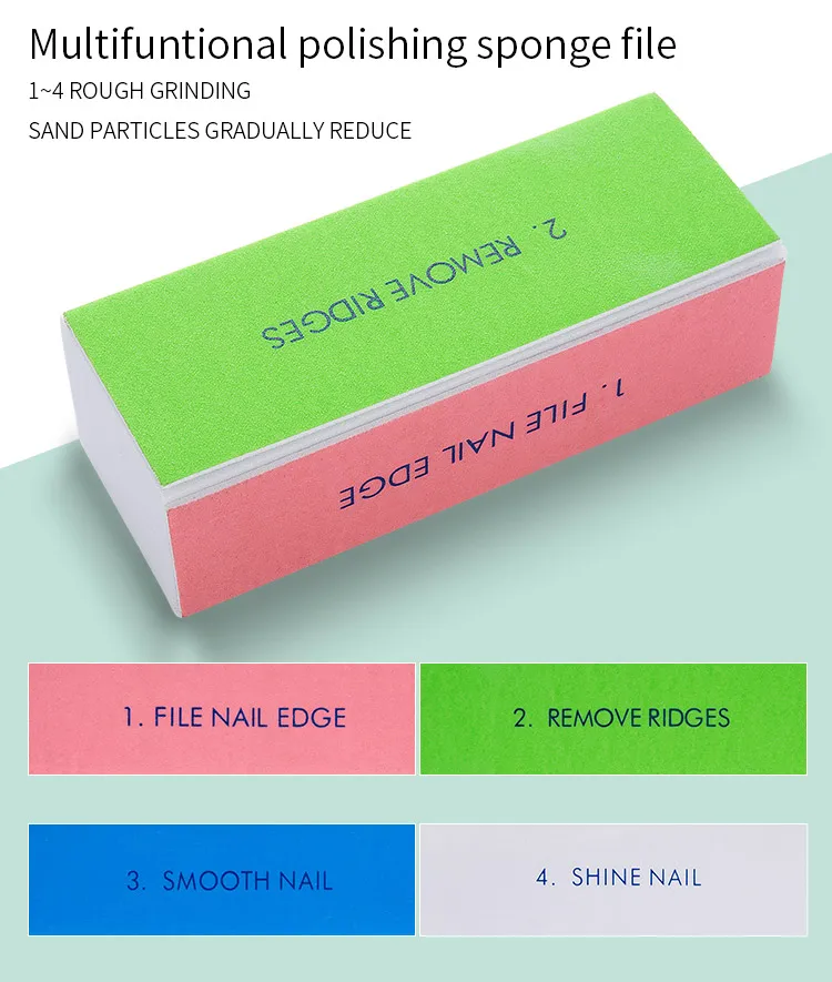 • Blocco di lucidatura colorato a 4 vie: il blocco di lucidatura colorato a 4 vie consente di una varietà di colori delle unghie per essere lucidato e lucidato in una seduta, che fa uno strumento per risparmiare tempo per manicure.
