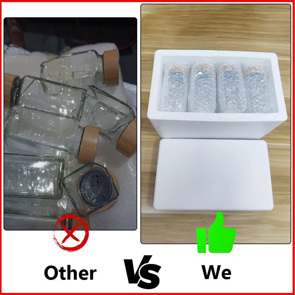 I barattoli sono carini, tutto è fatto con cura. I coperchi hanno un inserto in plastica all’interno e bambù all’esterno. C’è un dispenser. La scatola di schiuma si è rotta, ma fortunatamente i barattoli non si sono rotti. Gli adesivi sono leggermente spiegazzati, ma si possono raddrizzare senza problemi. Nel complesso, sono soddisfatto.