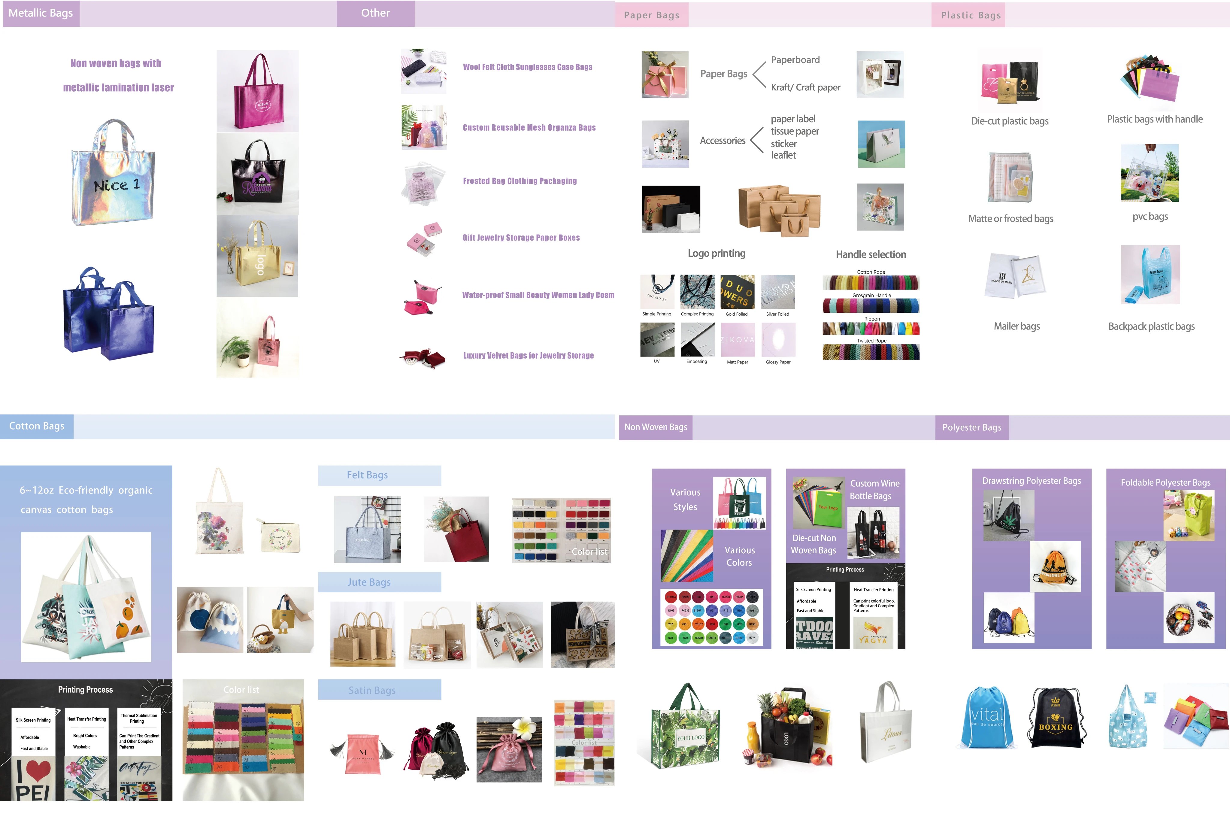 La nostra fabbrica è specializzata nella produzione di diversi tipi di borse (borse non tessute, borse metallizzate, sacchetti di cotone, sacchetti di carta, zaini…), diversi tipi di borse con la stampa del logo.