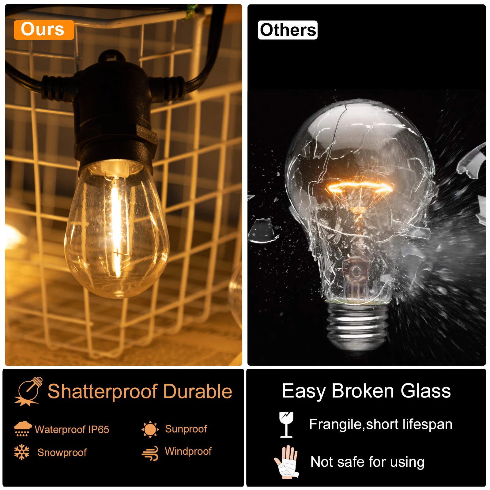 Lampadine LED bianche calde di sicurezza e ad alta efficienza energetica: luci a corda da esterno a LED impermeabili con lampadine LED trasparenti in plastica S14 (1 lampadine di ricambio), base standard E26 E27, lampadina LED da 1 W, CA 220 V-240 V.Stringa di luci da esterno a led per patio 85% più efficiente delle lampadine a incandescenza.Dura fino a 15.000 ore: risparmia sulle banconote energetiche mentre si diverte nell’atmosfera vibrante.